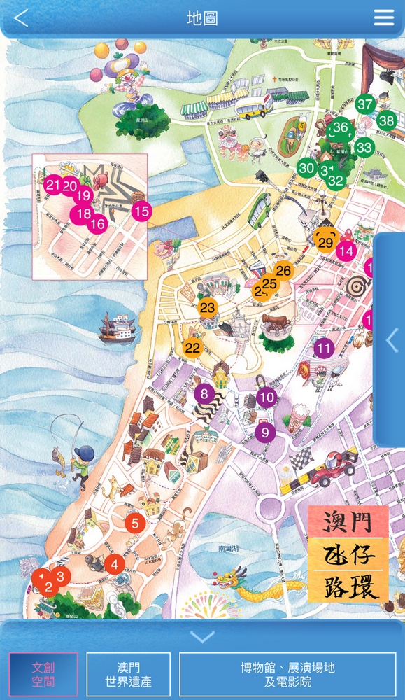 新版本《澳門文創地圖》手機應用程式在保留現有文創單位的內容上,首先增加“澳門世遺景點”與“博物館、展演場地及電影院”資訊,用戶可瀏覽各單位或景點之基本資訊、圖片及位置。“旅遊路線”為新版本應用程式的另一項新增內容,分為“堂區遊歷”及“特色文創旅遊路線”兩類,各條旅遊路線將不同類型的文創空間及世遺景點串連起來,引領用戶於澳門城區穿梭遊歷,細味藝文情懷,亦可以此作為出行之參考資訊。