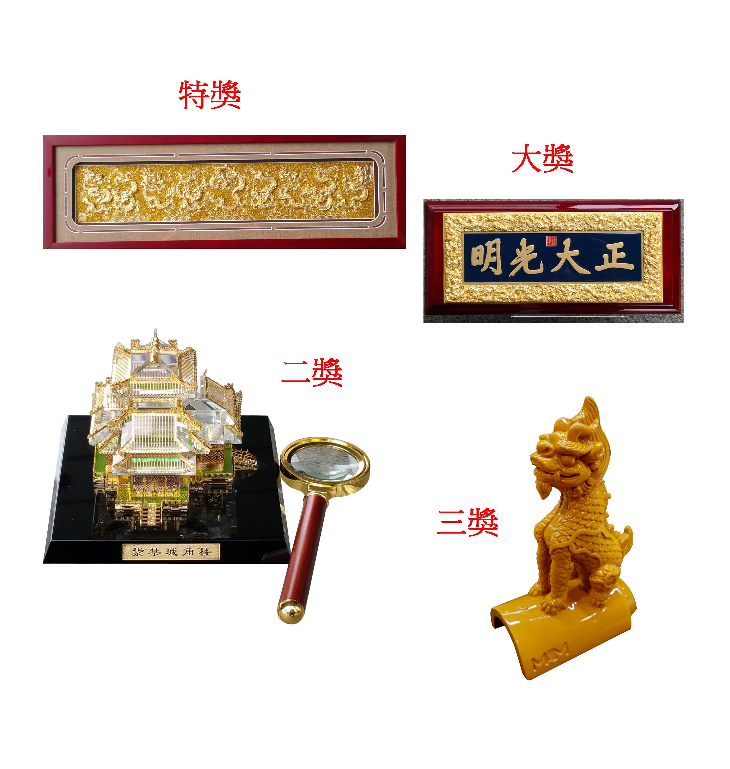 “太乙嵯峨”有獎問答遊戲共三期,每期設一項與展覽有關的問題,答中任何一期而被抽中者即可獲獎。活動設特獎一名、大獎四名、二獎五名、三獎三百名。特獎為“九龍壁”掛飾,價值一萬零二佰二十五澳門元;大獎為故宮“正大光明”匾,價值二千五佰九十澳門元;二獎為水晶角樓,價值一千二佰四十五澳門元;三獎可獲“太乙嵯峨”展覽紀念品瓦脊走獸(龍)磁石座。遊戲表格即日(一月二十日)起至二月二十八日於《澳門日報‧藝海版》刊登,表格亦可於藝博館一樓接待處、塔石廣場文化局大樓,以及民政總署各服務站、各市民服務中心索取,或可於藝博館網頁www.MAM.gov.mo下載。填妥之遊戲表格可投入置於上述地點的收集箱,或郵寄至澳門冼星海大馬路澳門藝術博物館,信封面註明“太乙嵯峨”有獎問答遊戲。