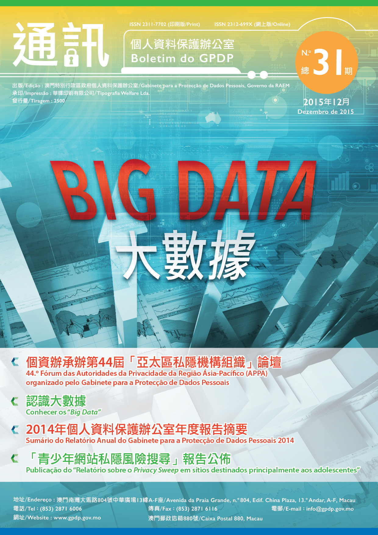 個人資料保護辦公室(下稱「個資辦」)最新出版的第31期《通訊》以「大數據」為主題,除向大眾簡介「大數據」這個發展潮流,還邀請專家分析大數據在澳門的應用潛力及探討大數據與私隱的關係,同時介紹了個資辦於去年12月舉行「大數據‧大挑戰──私隱保護與合作」研討會的情況。