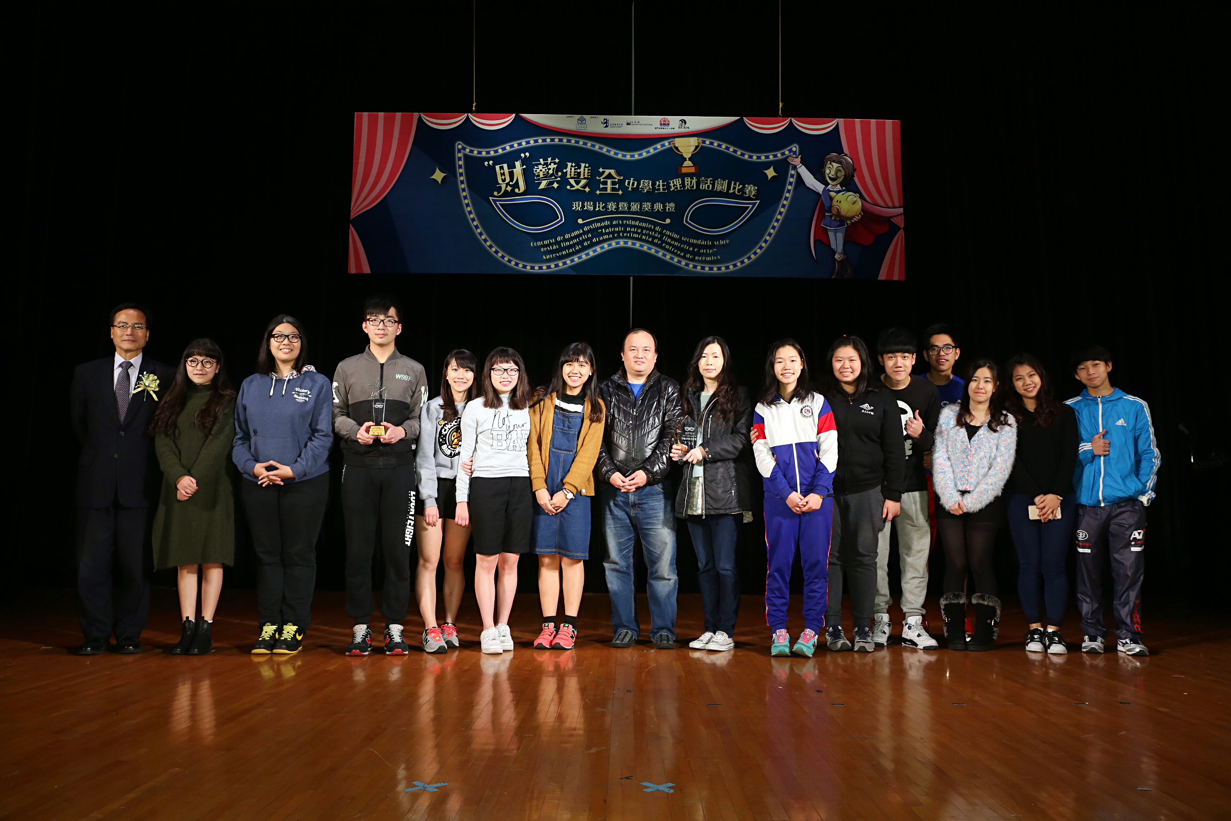 由社會保障基金主辦,教育暨青年局、文化局、澳門保險業中介人協會及曉角劇社協辦的“財”藝雙全中學生理財話劇比賽現場比賽暨頒獎典禮於1月30日假中葡職業技術學校順利舉行。澳門浸信中學參賽隊伍憑演出《理財之道》獲得最佳演出隊伍及最佳指導老師獎,工聮職業技術中學的周凱華、教業中學的林兆亨及培道中學的蕭瑩依次獲得傑出演員金、銀、銅獎。