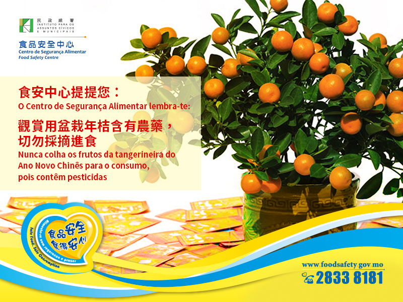 另外,春節期間不少市民及商戶都會擺放賀年盆栽以增添節日氣氛。觀賞用的盆栽、花卉及果實並非為供人食用而栽種,為了長時間保持其美觀及防治蟲害,有關花卉及果實可能在栽培過程中及上巿前被施放了農藥,農藥有機會殘留在植物上。視乎農藥性質、使用情況及攝入量等因素,農藥殘餘可能會對人體健康帶來急性或慢性的不良影響。食安中心特別呼籲市民,切勿採摘盆桔等觀賞性的果實或花卉作直接食用或加工醃製為食品用途,以保障自身健康。