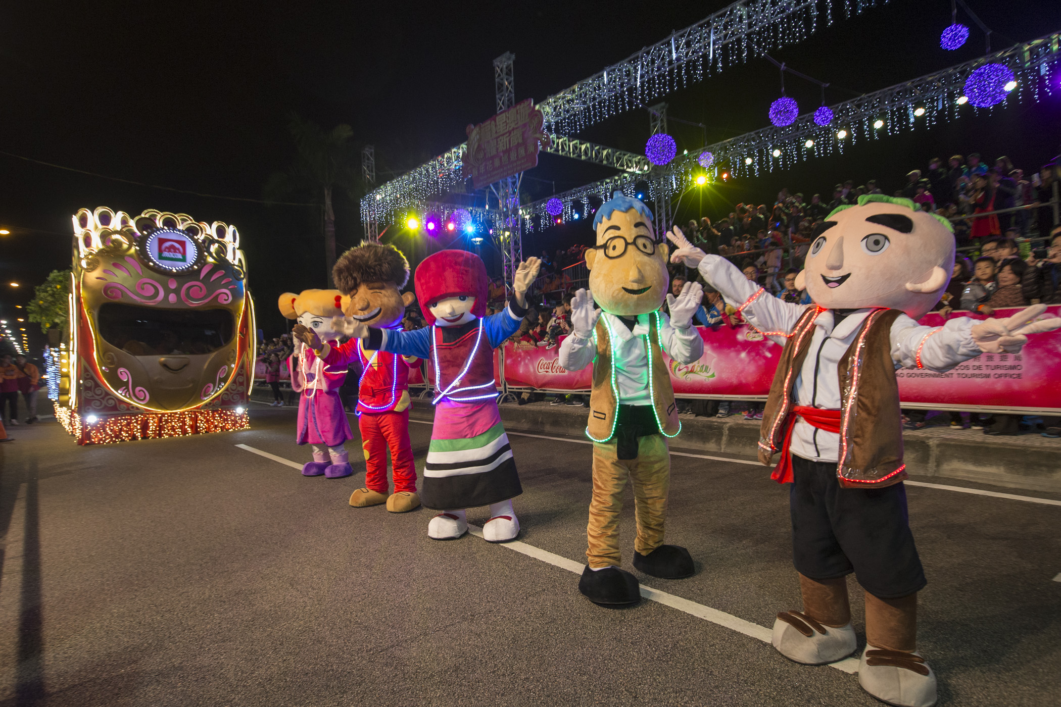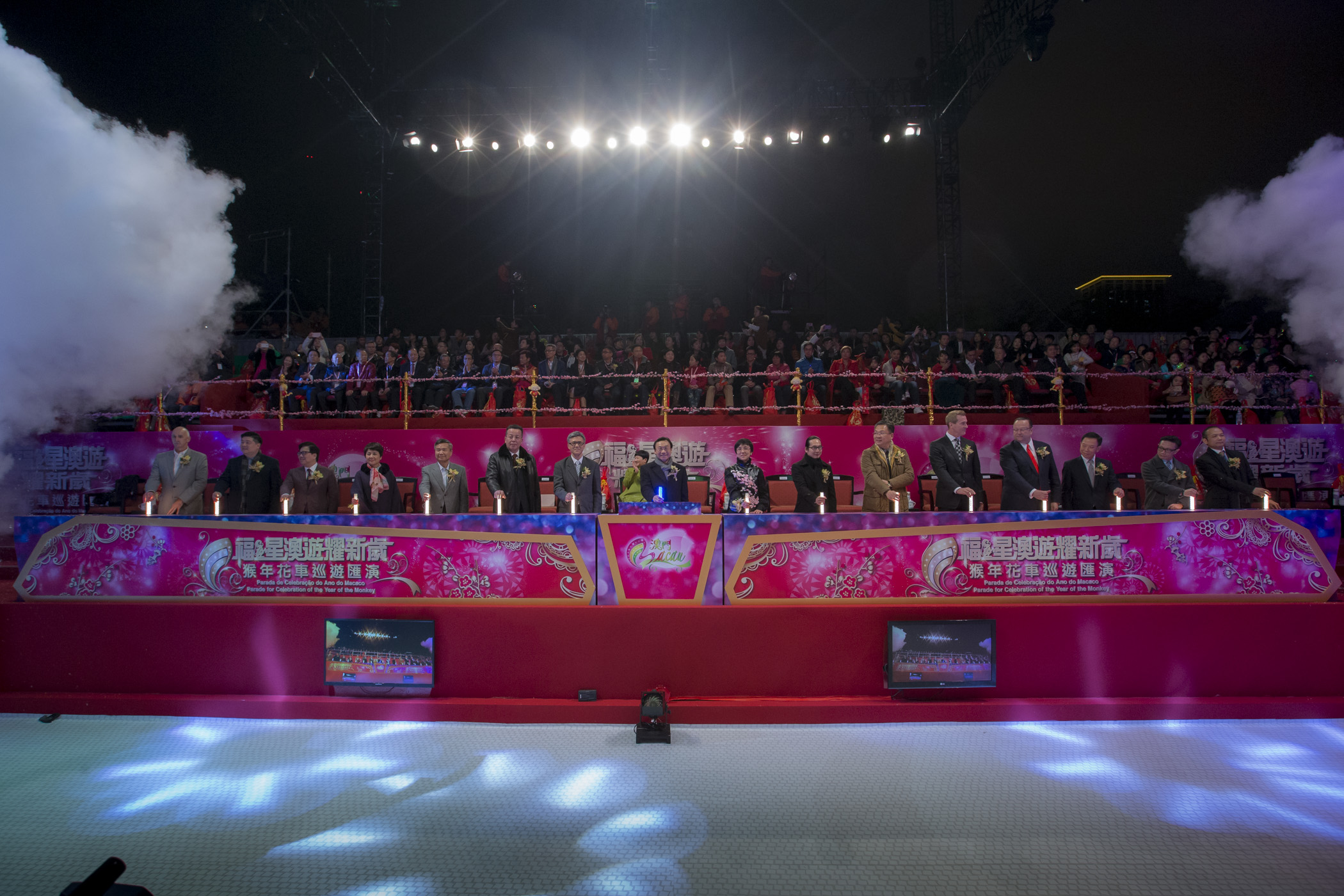 “福星澳遊耀新歲 猴年花車巡遊匯演”大型戶外賀歲活動於今(10日)晚舉行,為市民及旅客送上精彩節目,內容包括多媒體主題開幕表演、花車巡遊、千人匯演、港澳著名歌手獻唱、煙花表演及花車展覽等,與全城歡度新歲。整個花車巡遊匯演透過澳門兩家電視台及設於9個地點的屏幕直播現場盛況,將春節的熱鬧氣氛延至全城。