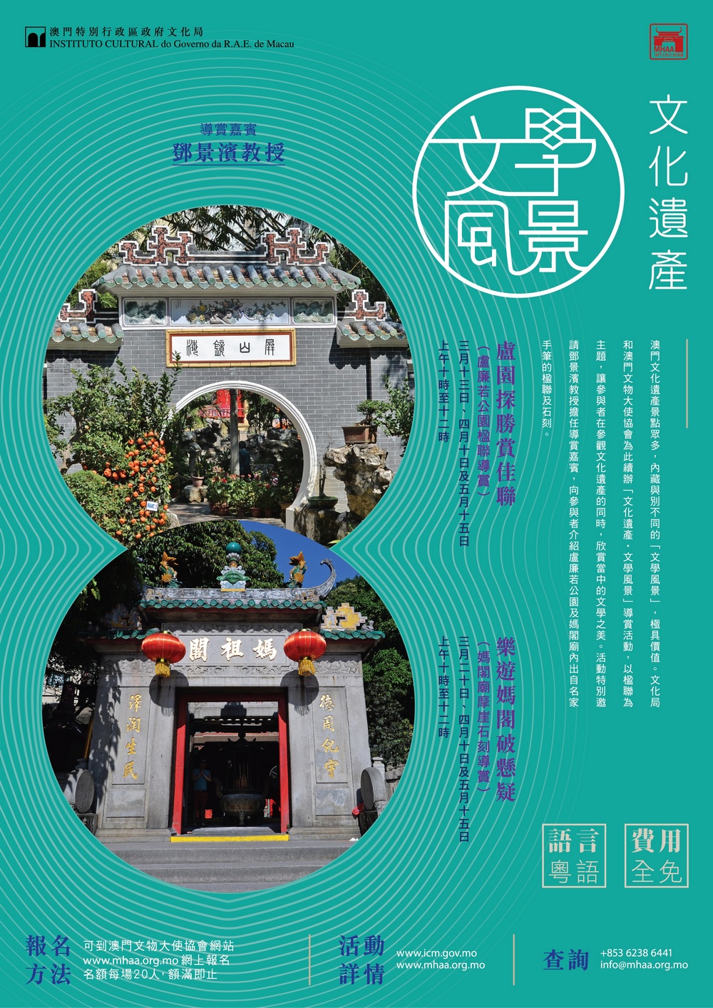 由文化局與澳門文物大使協會主辦的“文化遺產‧文學風景”導賞活動,將於三月至五月期間分別在盧廉若公園及媽閣廟舉行。歡迎有興趣的市民即日起報名參與,費用全免。