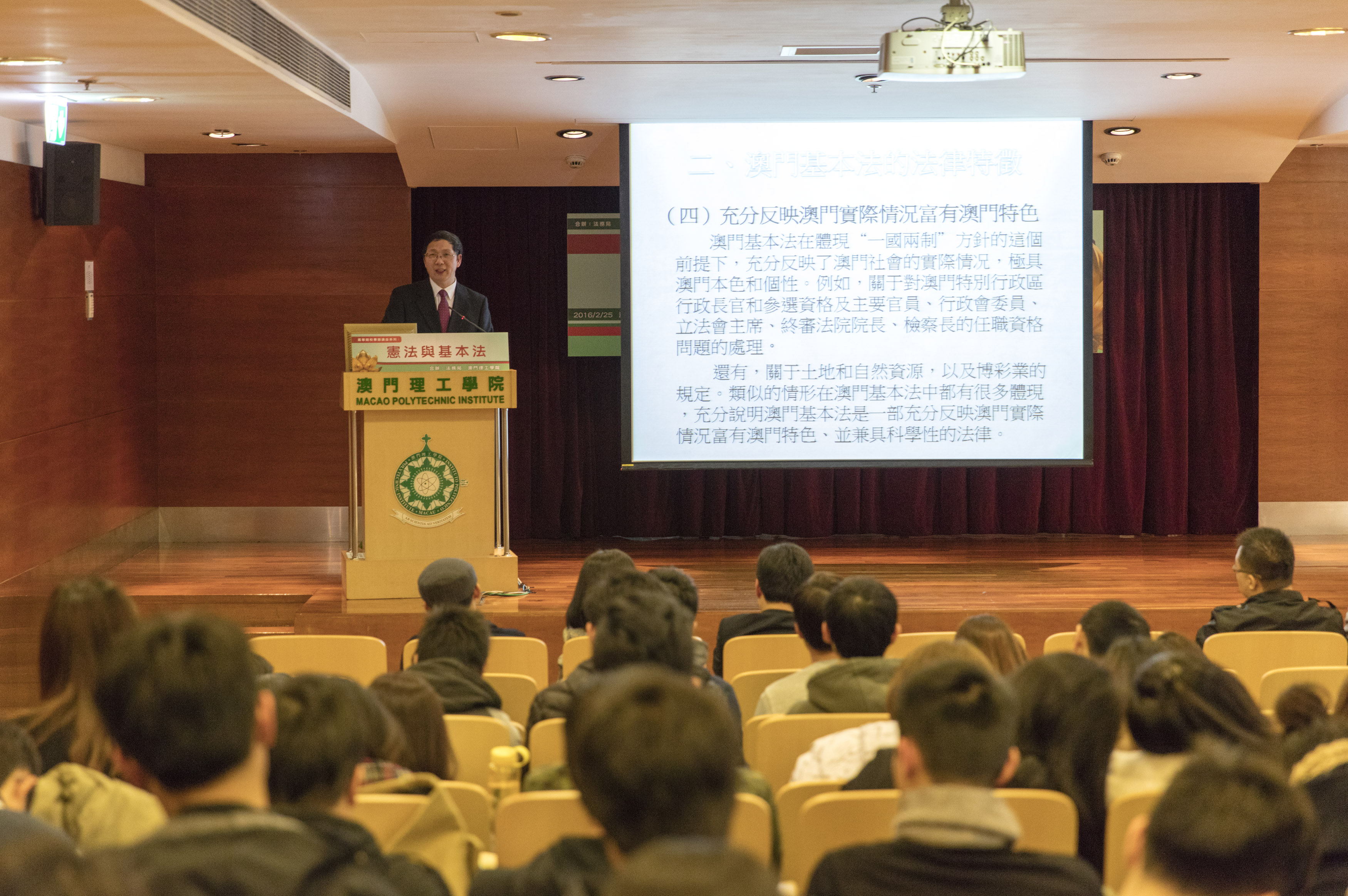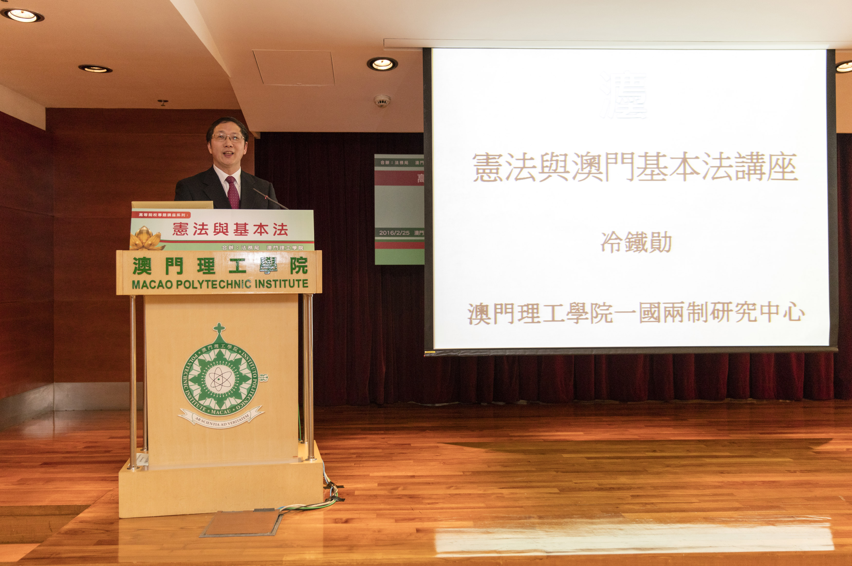 高等院校專題講座系列──憲法與基本法,今年首場已於本月二十五日在澳門理工學院舉行。是次專題講座由法務局與澳門理工學院合辦,以介紹憲法與基本法的關係為主題,邀請澳門理工學院一國兩制研究中心副主任冷鐵勛主講。法務局法律推廣及公共關係廳廳長羅靜萍、澳門理工學院公共行政高等學校校長嚴肇基,以及約一百名學生出席講座。