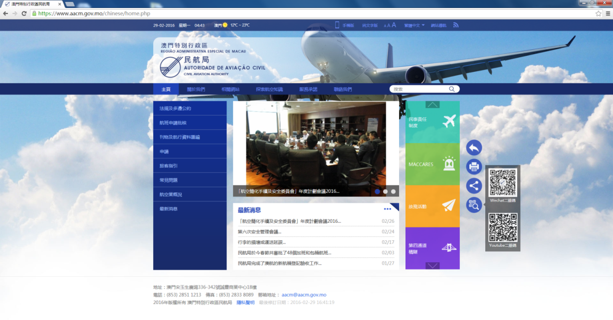 澳門特別行政區民航局今天推出全新網站,www.aacm.gov.mo,透過豐富資訊內容,優化市民意見反映渠道,美化版面設計,讓讀者能更便捷地進行瀏覽和搜尋。
