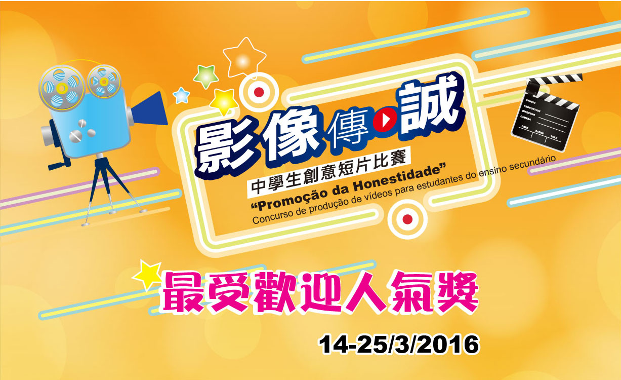 由廉政公署主辦的“影像傳誠”中學生創意短片比賽,高中及初中組各15條入圍短片已上載至廉政公署網站(www.ccac.org.mo)內的比賽專頁,歡迎全澳市民由即日起至本月25日登入網站,點擊Youtube短片的連結路徑,登入並按“Like”投選最喜愛的短片,獲得最多“Like”的作品將獲得“最受歡迎人氣獎”。