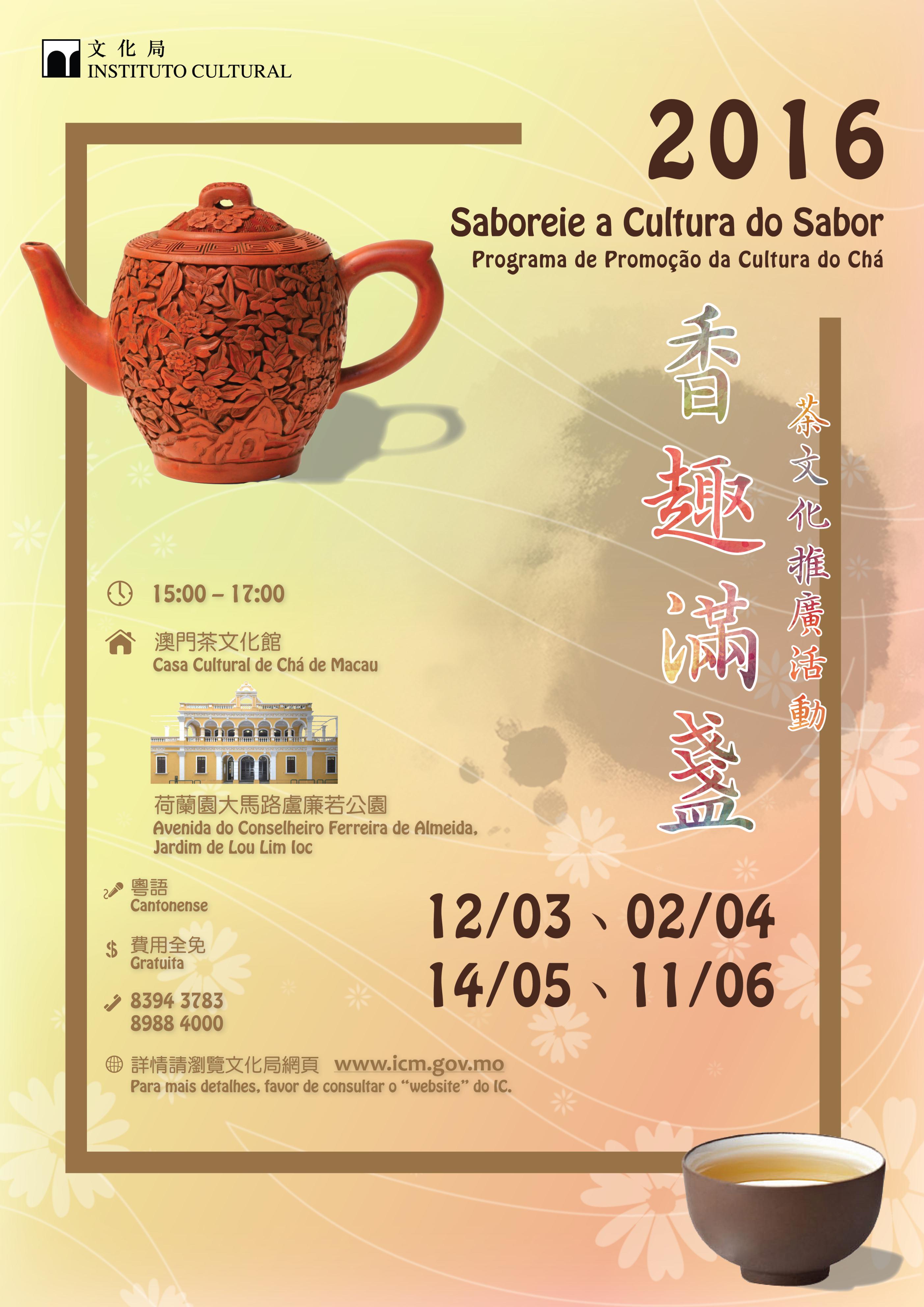 四月份的茶會將於四月二日(星期六)在澳門茶文化館舉行,由皇家瓷器彩繪導師陳靜儀主持“親子瓷器茶具彩繪工作坊”,對象為十二組親子,每位兒童須由一名家長陪同,以抽籤方式錄取,費用全免。瓷器彩繪是融合藝術和瓷器製成的作品,在導師指導下,兒童和家長選擇喜愛的轉寫紙,然後共同構思茶具上的構圖,以拼貼的方式製作一組注滿愛心,風格花紋獨一無二的茶具。製作過程簡易,即使不諳繪畫的兒童和家長也可以做出媲美專業的茶具,享受瓷器彩繪創作的樂趣。工作坊以廣東話進行,即日起至三月二十五日(星期五)截止報名,獲錄取者將有專人致電通知。報名或查詢可於辦公時間內致電八三九四三七八三,亦可瀏覽文化局網頁www.icm.gov.mo。