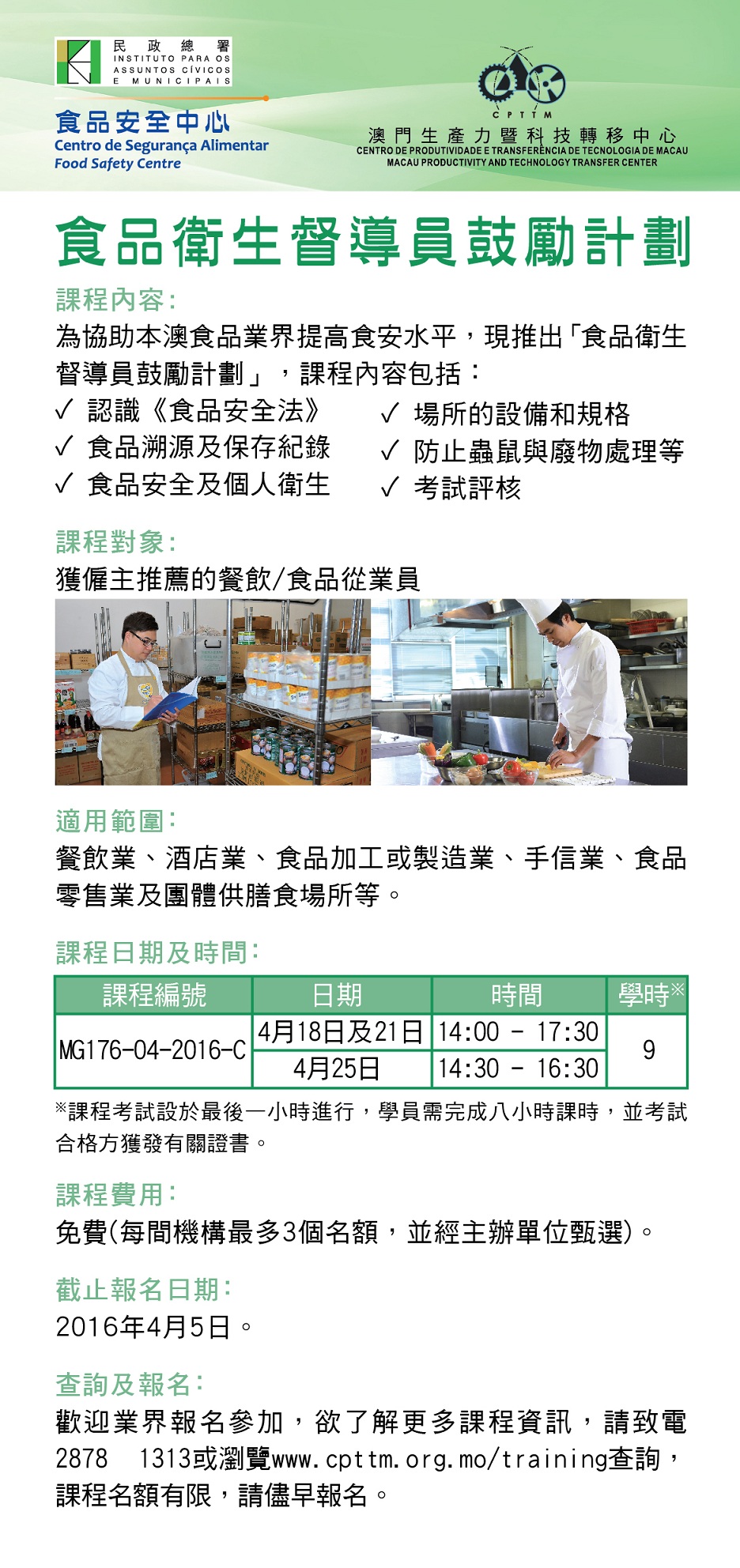 為提升從業人員的食安水平,協助業界做好食品安全預防工作,民政總署委託澳門生產力暨科技轉移中心開辦“食品衛生督導員課程”,每月舉辦一場,四月份課程將於四月十八日起在澳門生產力暨科技轉移中心舉辦,鼓勵僱主積極推薦員工報讀,截止報名日期為四月五日。