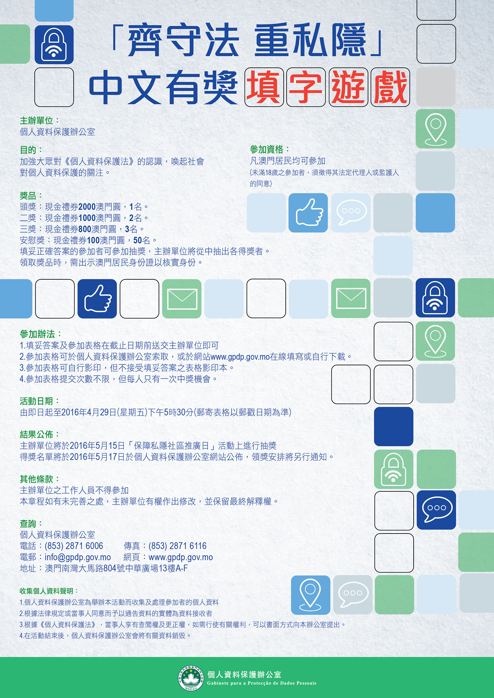 個人資料保護辦公室舉辦「齊守法重私隱」中文有獎填字遊戲,期望透過輕鬆方式加強大眾對《個人資料保護法》的認識,喚起社會對私隱的關注,歡迎澳門市民踴躍參加,既可贏取豐富獎品,又可支持澳門個人資料保護的推廣工作。