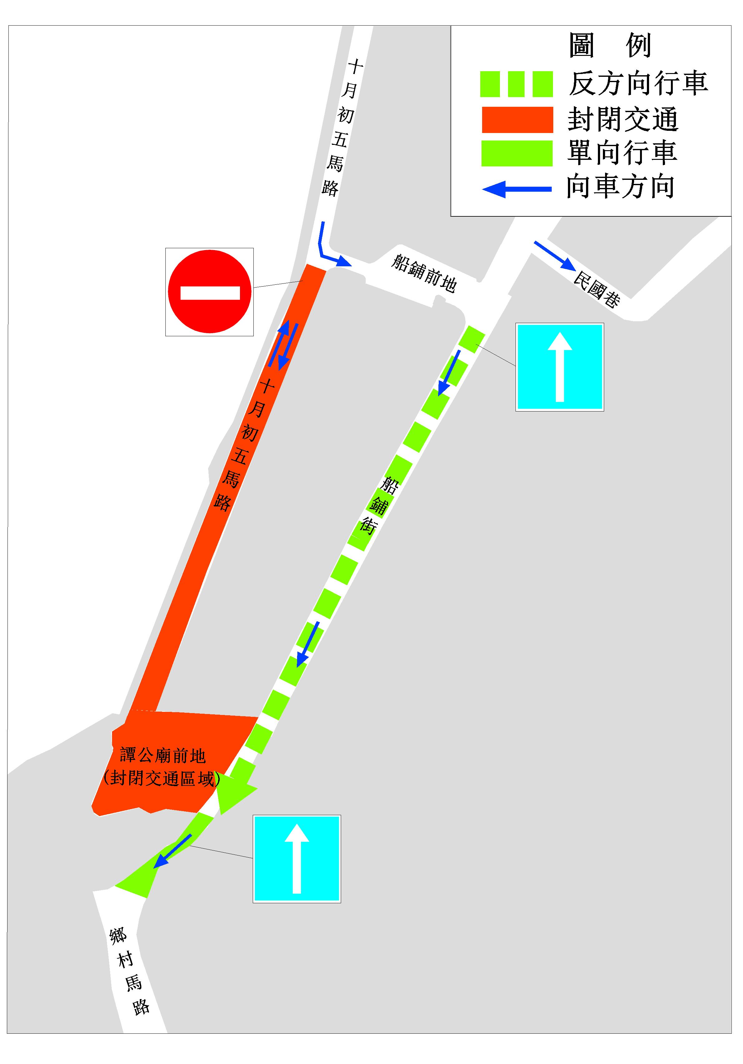 本月7日(周四)上午9時至5月27日(周五)下午5時,介乎船鋪前地與譚公廟前地的一段十月初五馬路、譚公廟前地及菜園巷實施封閉交通,相關路段禁止泊車。與此同時,介乎民國巷與菜園巷之間一段民國馬路、鄉村馬路近港務局路環分局的一段改為無出口道路;介乎船鋪前地與譚公廟前地之一段船鋪街改反方向行車,車輛須由船鋪前地往譚公廟前地方向行駛;介乎譚公廟前地與港務局路環分局之一段鄉村馬路實施單向行車,即車輛只能由譚公廟前地往港務局路環分局方向行駛。