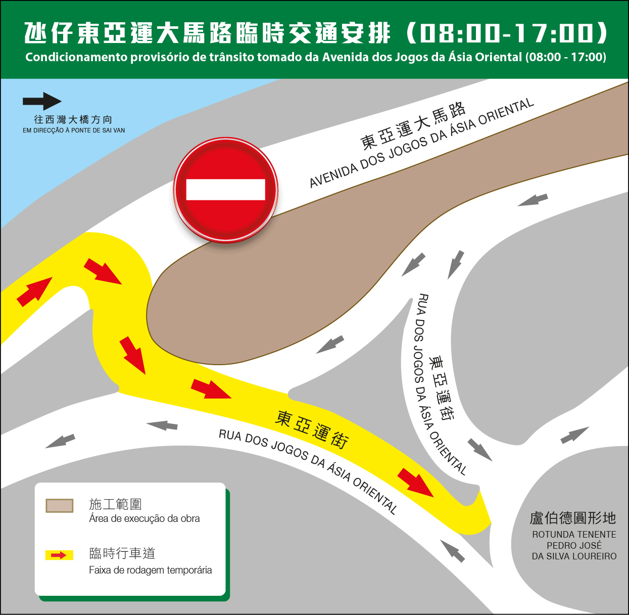 因應輕軌車站行人天橋及道路重鋪施工,周五(22)日起氹仔機場大馬路、東亞運大馬路及偉龍馬路將分階段實施臨時交通安排,包括臨時封閉交通及有限度通車措施。運輸基建辦公室與交通事務局呼籲公眾留意。