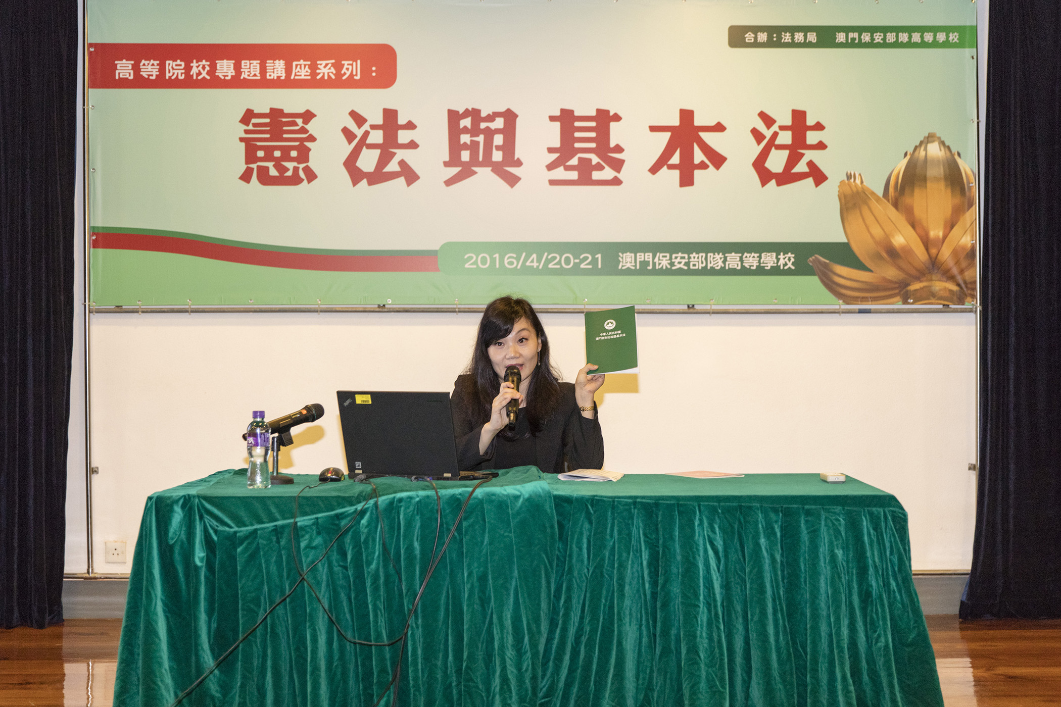由法務局和澳門保安部隊高等學校合辦的高等院校專題講座系列──憲法與基本法,於四月二十及二十一日在澳門保安部隊高等學校舉行,講座由法務局法律專家劉倩主講,法務局法律推廣及公共關係廳廳長羅靜萍,澳門保安部隊高等學校綜合訓練中心主任陳宇川等出席,兩場講座合共二百多名保安學員參與。