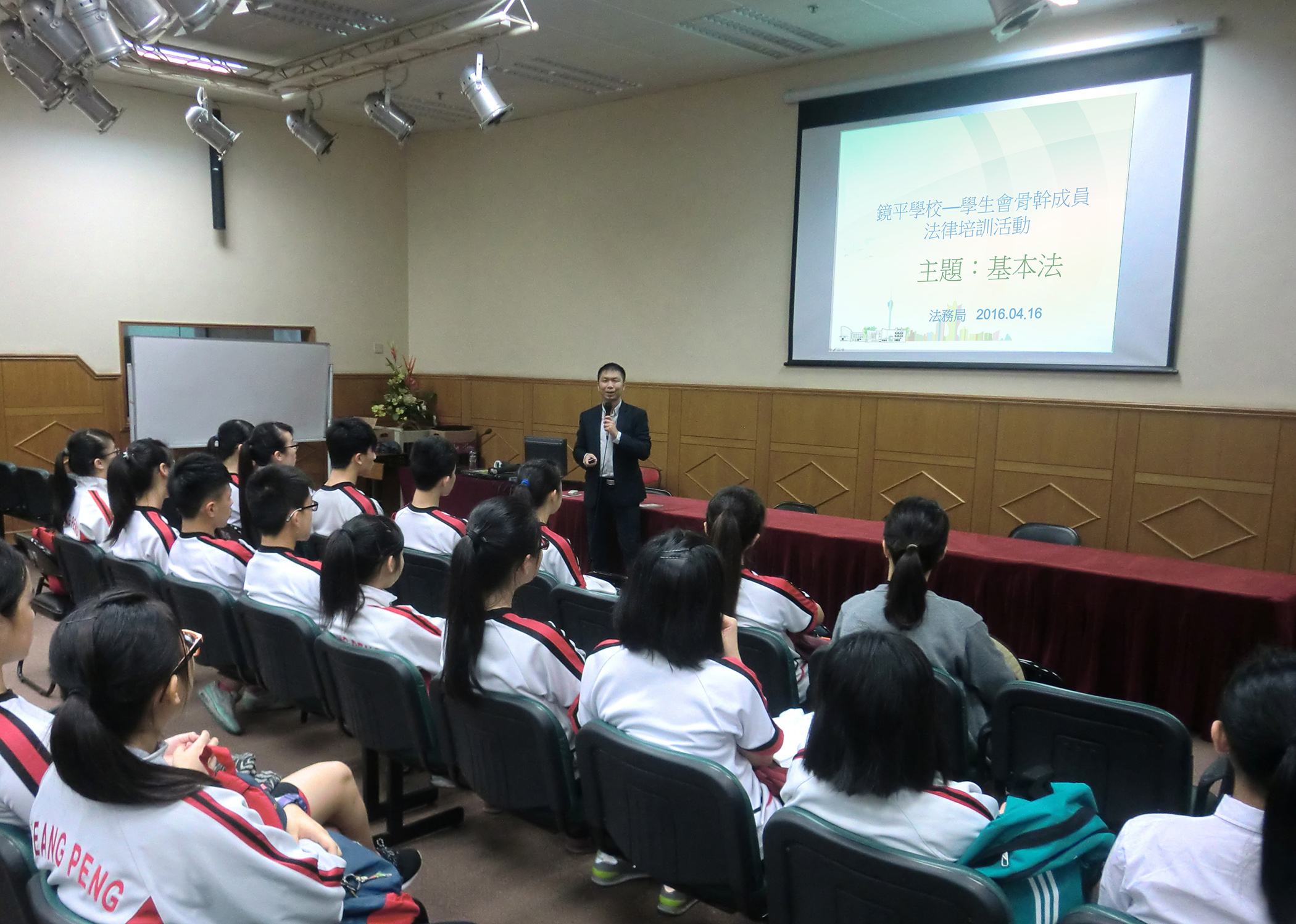 是次培訓講座舉行了兩場,第一場於四月十六日在鏡平學校小禮堂舉行。參與者為鏡平學校中學部學生會骨幹及高一、高二級骨幹成員,由法務局法律人員蔣永恆先生主講,內容包括《基本法》在澳門特區的地位、“一國兩制”、“澳人治澳”和高度自治的含義、《基本法》與居民生活的種種關聯、澳門特區的政治體制,以及行政長官和立法會的選舉法等。