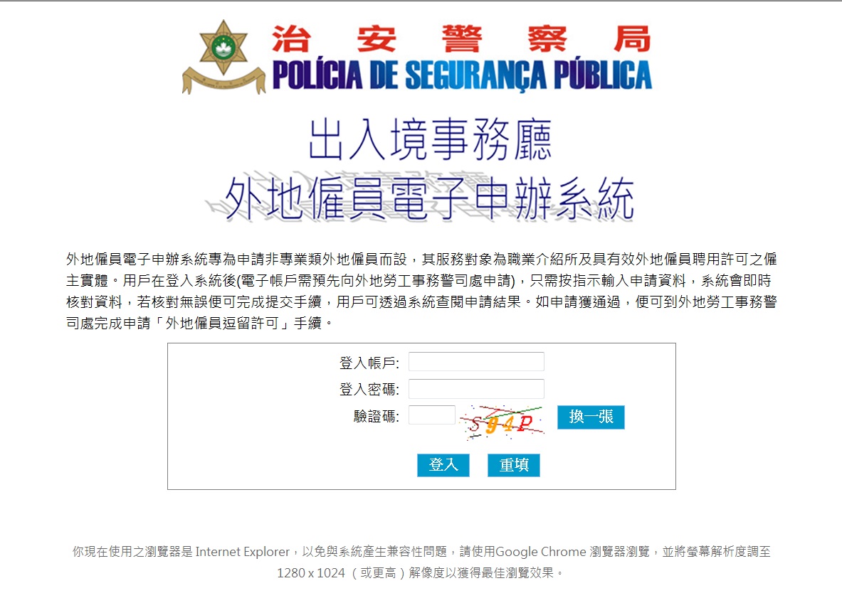 為積極配合政府電子政務的發展,提高行政效率,加強訊息化建設,以提供更便捷和優質的服務,治安警察局出入境事務廳將於2016年5月3日,在原「外地僱員電子申辦系統」的基礎上,推出第二階段網上申請服務-非專業類「外地僱員逗留許可」網上新申請服務,此項服務手續的審批時間由以往的5個工作日縮減至4個工作日,提升申辦效率。本項服務的對象主要是僱主實體及獲僱主實體授權的職業介紹所,申請沒有時間及數量限制。倘首次使用「外地僱員電子申辦系統」,僱主實體或代理職業介紹所須填妥《代辦手續人員登記表》(http://www.fsm.gov.mo/psp/cht/pdf/psp_top6/CTNR-M22.pdf),然後憑該登記表到治安警察局出入境事務廳外地勞工事務警司處申請「外地僱員電子申辦系統」電子帳號,合資格者將獲發一個用於登入上述系統以辦理各項申請手續的用戶名及密碼。已授權職業介紹所申辦手續之僱主實體,無需另行申請開通「外地僱員電子申辦系統」電子帳號。