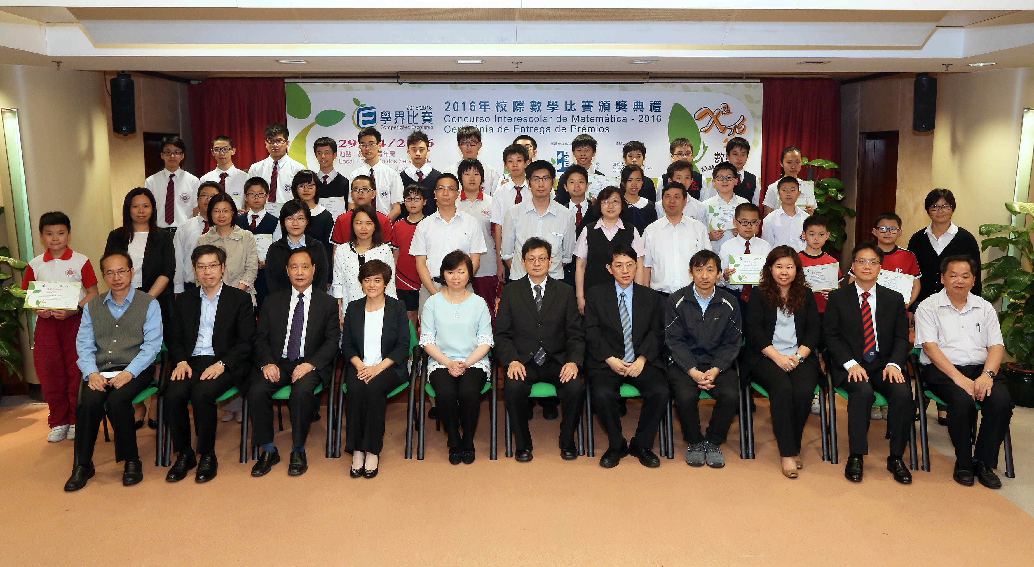 由教育暨青年局主辦、澳門大學科技學院協辦的“2016年校際數學比賽”於日前順利完成,並於4月29日舉行了頒獎典禮。出席的嘉賓包括教青局副局長老柏生,澳門大學科技學院副院長王百鍵及助理教授梁應德,以及多所中、小學學校校長。主、協辦單位希望透過是項比賽,培養學生研習數學的精神,提升學生的數學能力,並藉此發掘具潛質的小學、初中及高中學生參加地區性和國際性的數學賽事,增強與不同地區學生的學科交流,擴闊視野。
