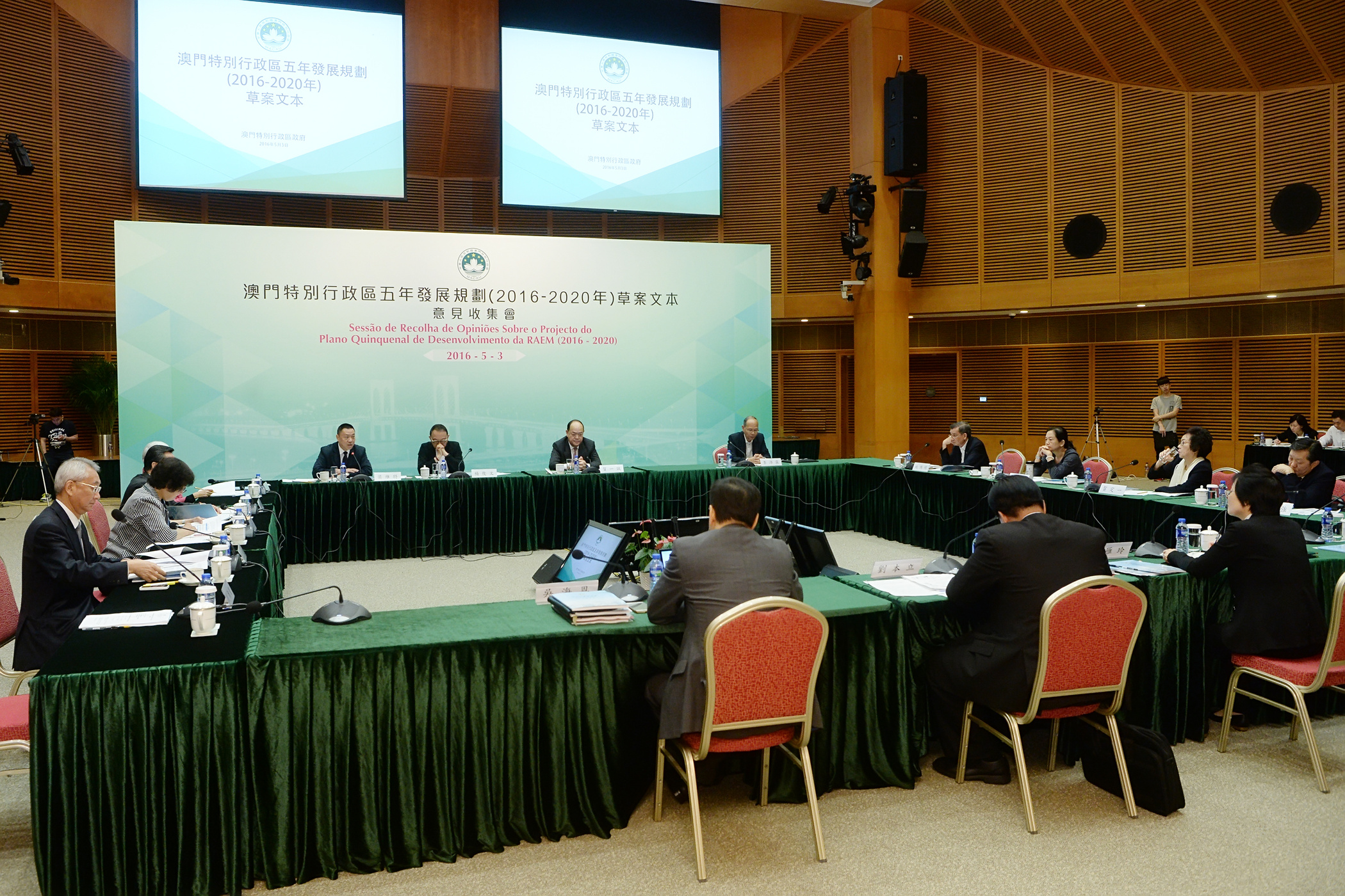 《澳門特別行政區五年發展規劃(2016-2020年)草案文本》於4月26日公佈並展開為期兩個月的意見收集工作。五年發展規劃是未來五年特區經濟社會發展的總體藍圖,是政府與廣大居民共同努力的行動綱領。因此,廣泛聽取社會各界意見、凝聚共識、匯合民力,對於五年發展規劃的制定和實施相當重要。為此,專責本次意見收集工作的政策研究室今日(3日)假澳門科學館會議廳舉行「澳區全國人大代表、全國政協委員專場意見收集會」,全國人大常委賀一誠、全國政協常委楊俊文,全國人大代表李沛霖、林笑雲、姚鴻明、高開賢、容永恩、梁玉華、梁維特,以及全國政協委員賀定一、林金城、黎振強出席了意見收集會,就五年發展規劃草案文本發表意見。政策研究室主任劉本立、行政長官辦公室顧問李雁玲及政策研究室副主任吳海恩出席了意見收集會,並聽取了有關的意見。