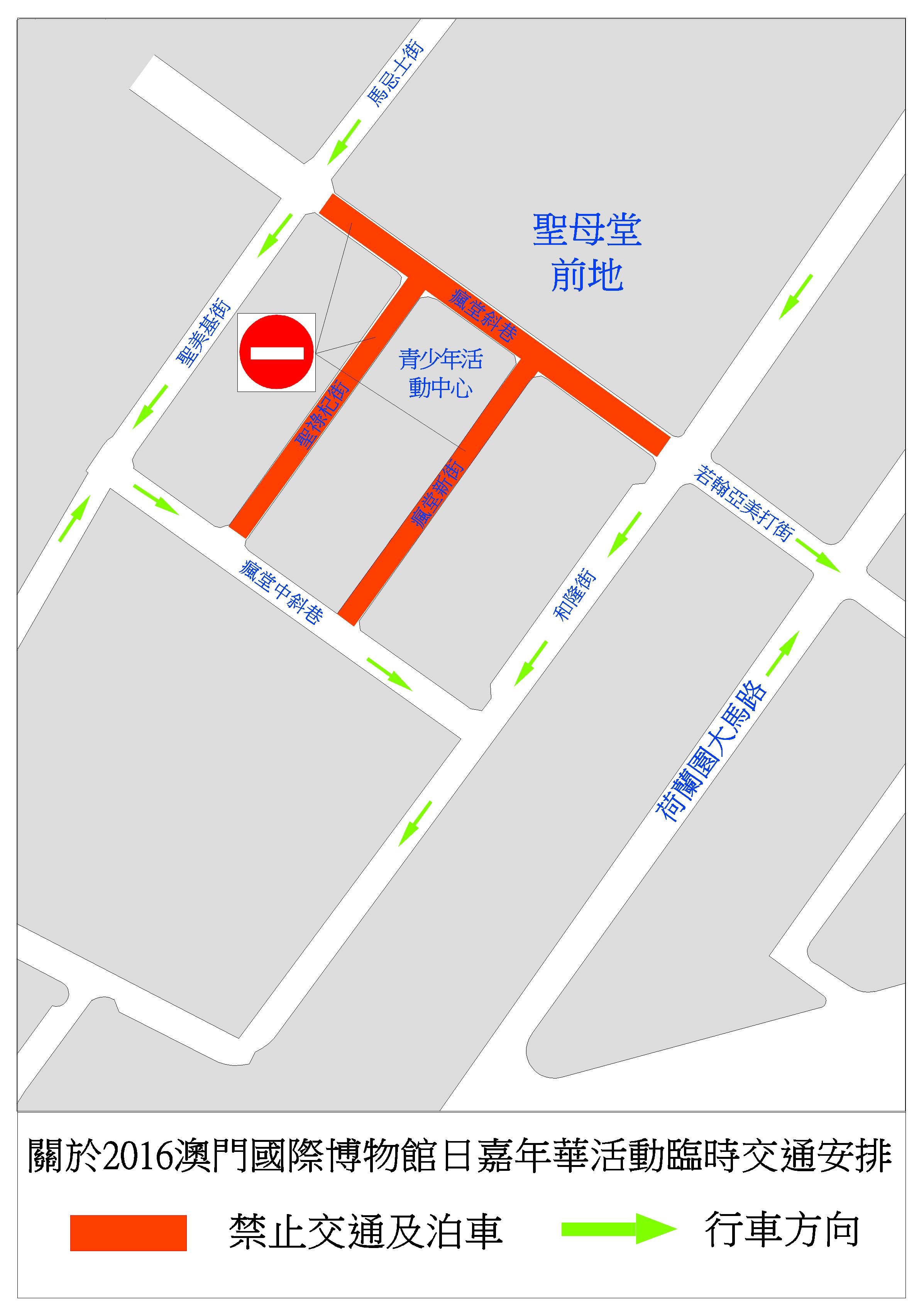 配合文化局舉辦博物館日嘉年華活動,本月8日(周日)上午9時至晚上8時,介乎馬忌士街與和隆街之間的一段瘋堂斜巷、介乎瘋堂中斜巷與瘋堂斜巷之間的瘋堂新街、介乎瘋堂中斜巷與瘋堂斜巷之間的聖祿杞街實施封閉交通;介乎瘋堂斜巷與瘋堂中斜巷之間的一段聖美基街、介乎聖美基街與和隆街之間的一段瘋堂中斜巷改反方向行車。相關路段部分咪錶泊車位及電單車泊車位於本月7日(周六)晚上10時起暫停使用,直至活動結束。