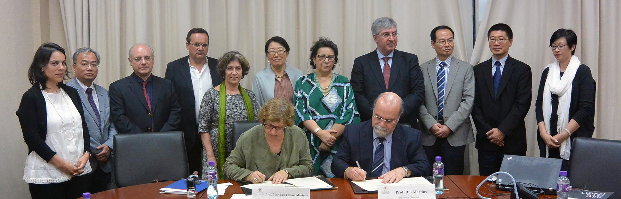 協議書簽署儀式在波爾圖大學醫學院院長Amélia Ferreira教授、生物醫學研究院院長António Sousa Pereira教授、生物醫學研究院副院長Luís Baldaia教授、工程學院教授及系統電腦工程科技研究院研究員Vladimiro Miranda教授、文學院教授及教授葡語為外語/第二語言碩士課程主任Isabel Margarida Duarte教授,以及澳大人文學院院長靳洪剛教授、健康科學學院副院長葛偉教授、科技學院副院長譚錦榮教授和中華醫藥研究院副院長葉德全教授的見證下,由Fátima Marinho教授與馬許願教授代表簽署。