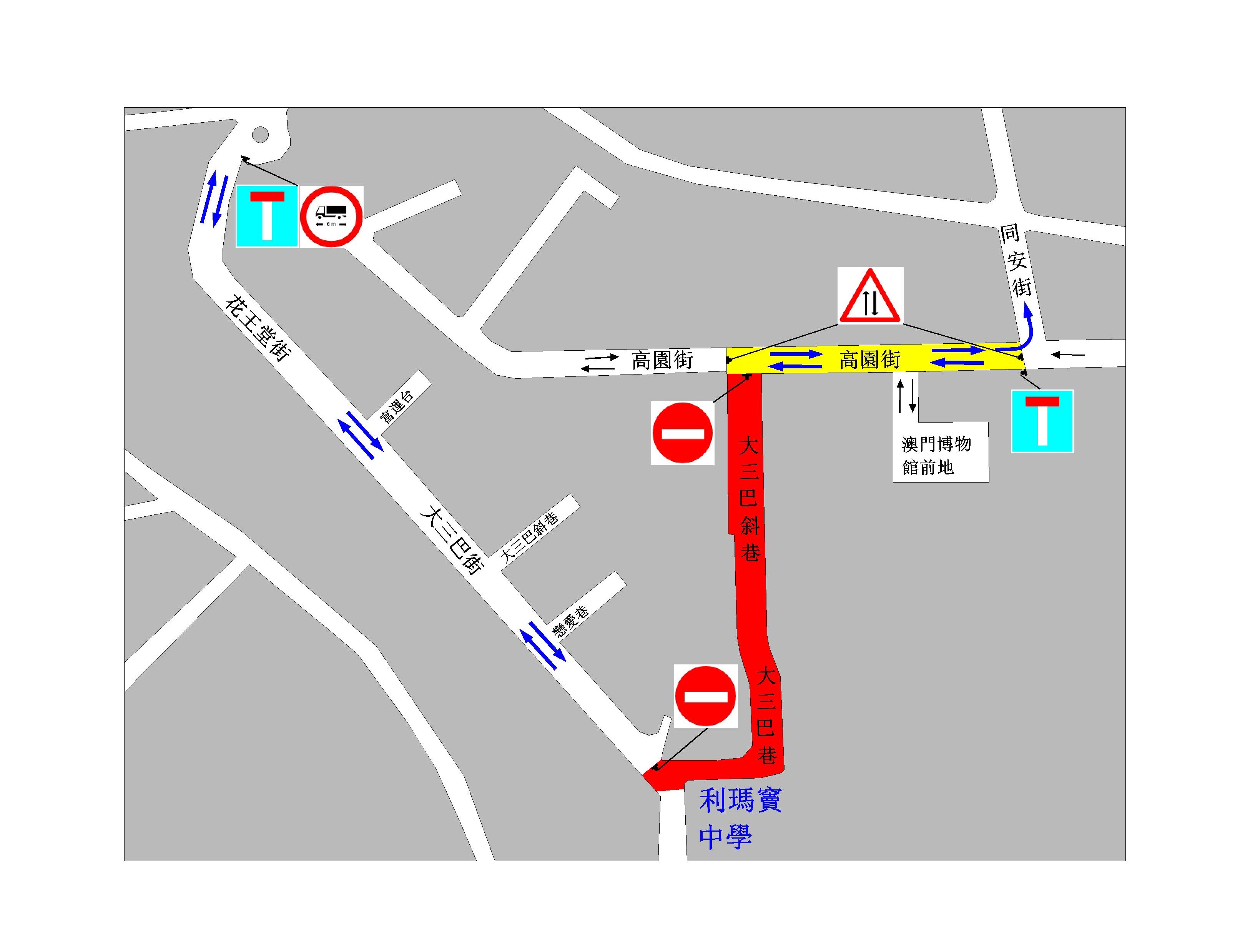 因鋪設電纜,大三巴巷及大三巴斜巷本月9日(周一)上午10時起臨時封閉,禁止車輛駛入及停泊;花王堂街及介乎同安街與大三巴斜巷之間的一段高園街則改為無出口道路,並禁止車長超過6米之車輛駛入花王堂街。配合施工,本月7日(周六)起,上述路段及大三巴街部分咪錶泊車位及電單車泊車位會暫停使用。工期約17日。
