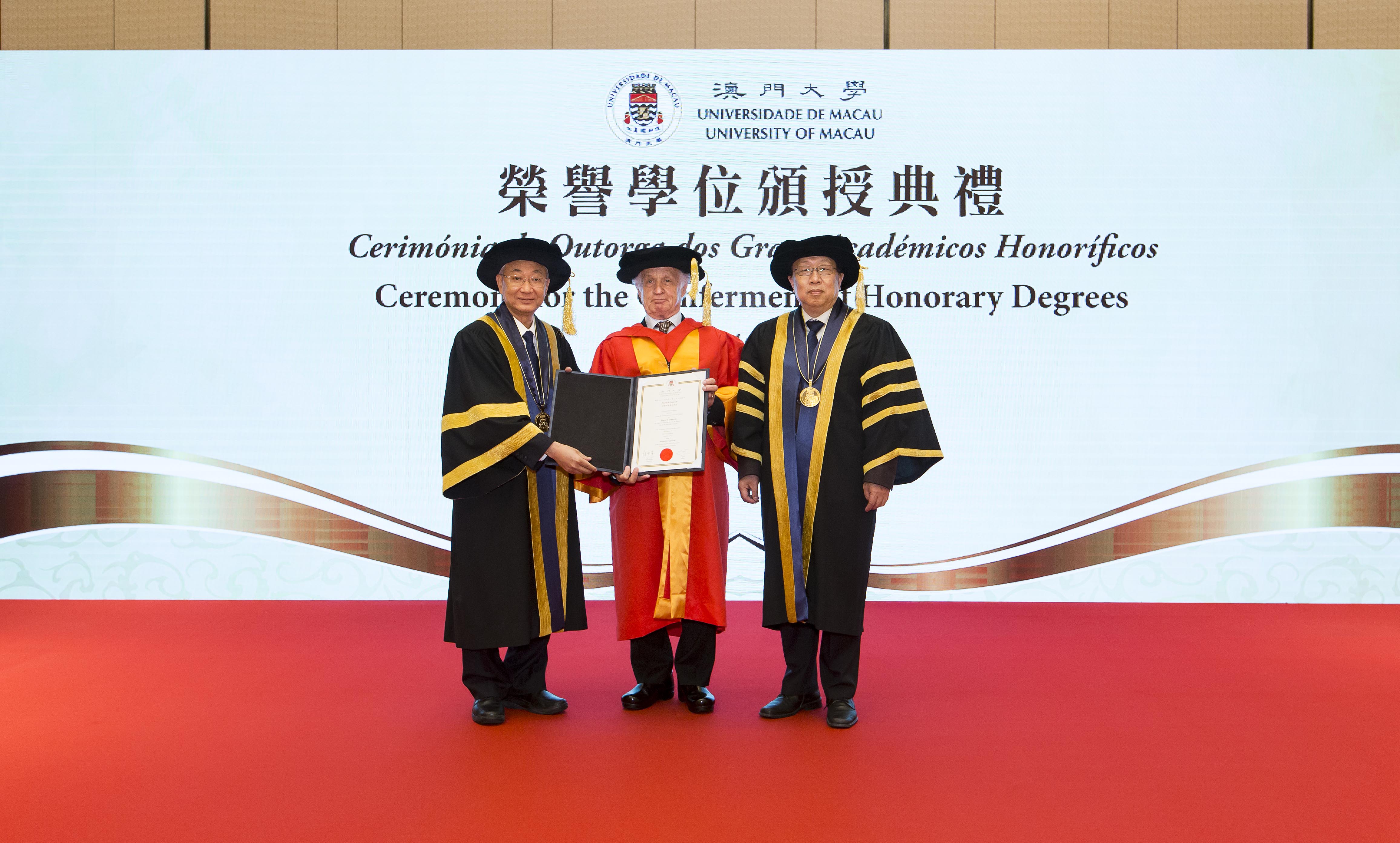 澳門大學今(23)日向諾貝爾生理學或醫學獎得主馬里奧‧卡佩奇教授(Mario Capecchi)頒授榮譽理學博士學位,以表彰他在“基因靶向技術"研究上取得的豐碩成果,為治療腫瘤頑疾帶來光明。同場,卡佩奇進行演講,與社會各界人士、科研人員、澳大師生等交流。