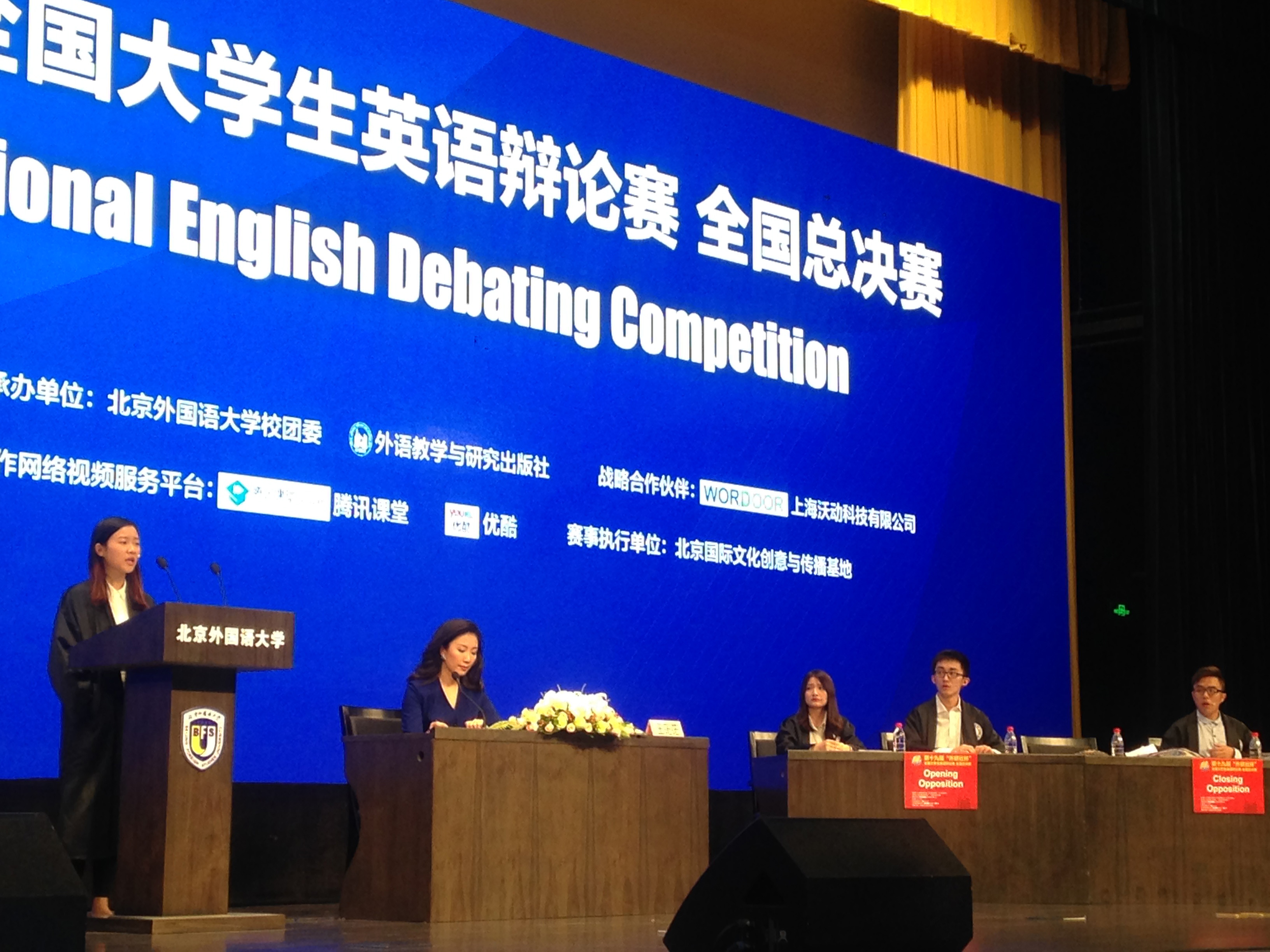 “外研社杯”全國大學生英語辯論賽是國內最高級別的英語辯論賽事,今屆參加的大學包括清華大學、北京大學、北京外國語大學、上海財經大學、北京外交學院等。今屆比賽於去年10月開始啟動遍及全國500所高等院校的校園選拔活動,經過校級的層層嚴格篩選,各校派出最強的一支隊伍參加地區複賽,每個地區賽排名靠前的隊伍才可晉身全國總決賽。
