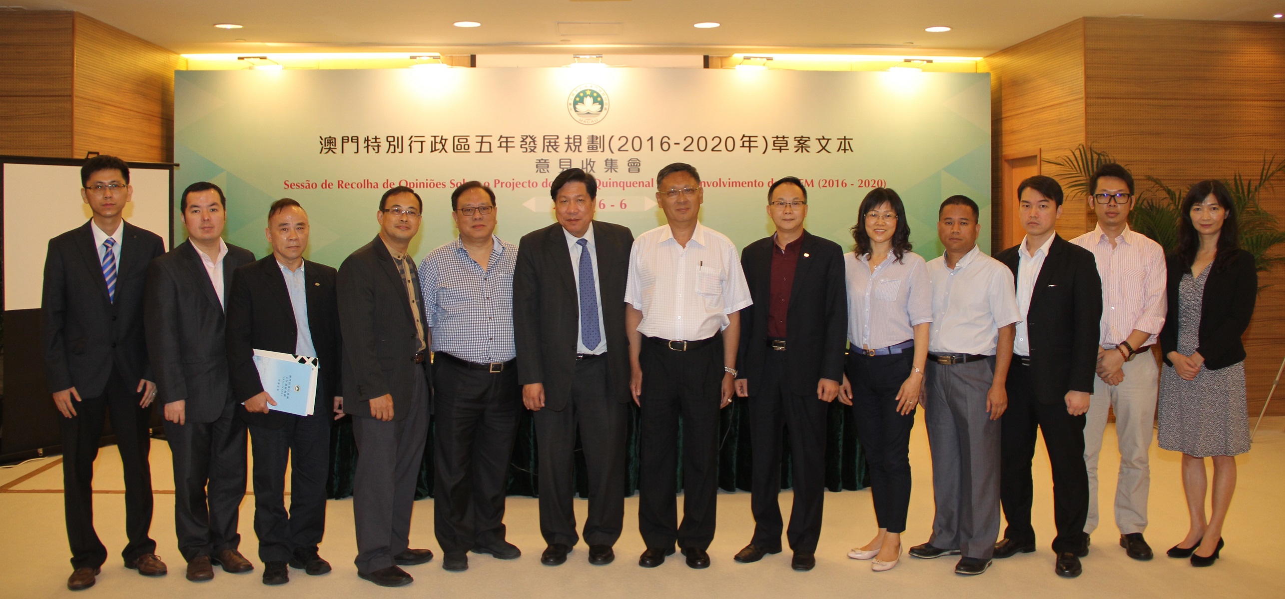 《澳門特區五年發展規劃(2016-2020年)草案文本》於4月26日公佈並展開為期兩個月的意見收集工作。專責本次意見收集工作的政策研究室今日(6月6日)上午於政策研究室舉行了地產及鄉誼社團專場的意見收集會。政策研究室主任劉本立、職務主管高展明及研究員連信森出席了意見收集會,並聽取了與會人士的意見。