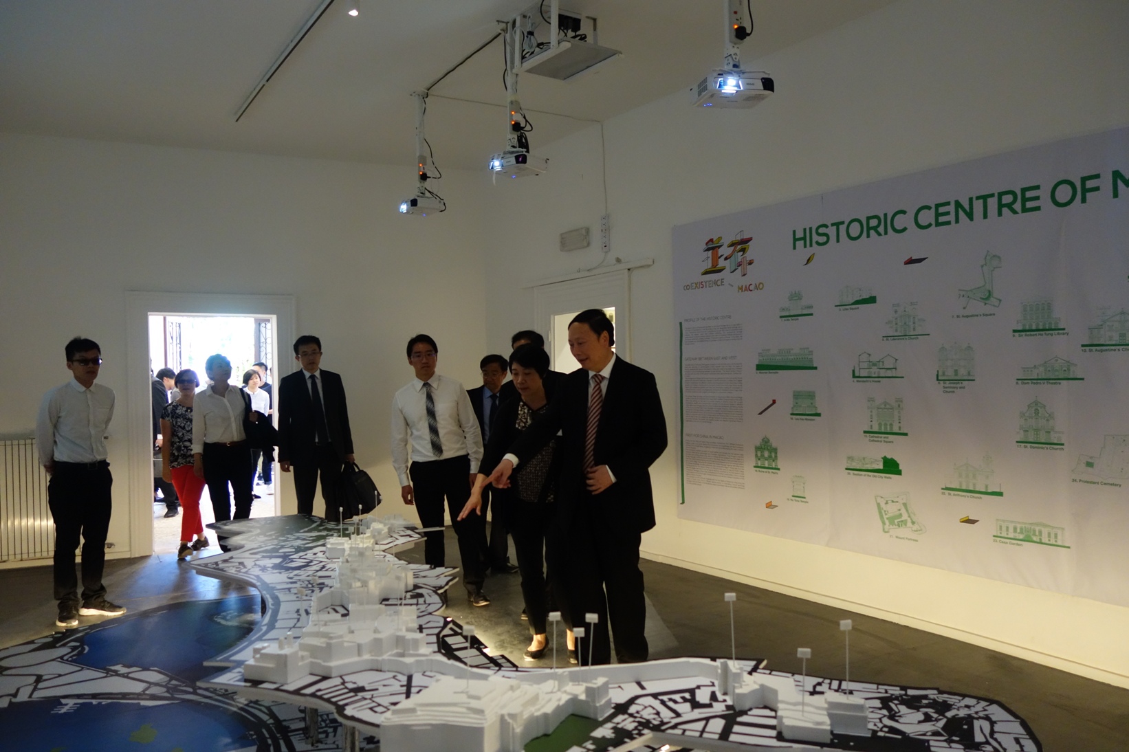 文化局文化遺產廳廳長梁惠敏帶領參展團隊,向來賓就澳門展館之策展理念及展覽內容進行詳盡介紹,參展團隊中的“文化特攻”成員,亦即場示範傳統建築工藝之運用及操作方式;國家文化部一行特別對展館展示的修復技術及傳統建築材料感興趣,雙方互動交流,氣氛熱烈。隨行來賓還有中國駐意大利使館文化參贊張建達、國家文化部外聯局局長助理鄭浩、國家文化部外聯局西歐處處長尚繼媛,以及中國對外文化集團副總經理閻東等人。