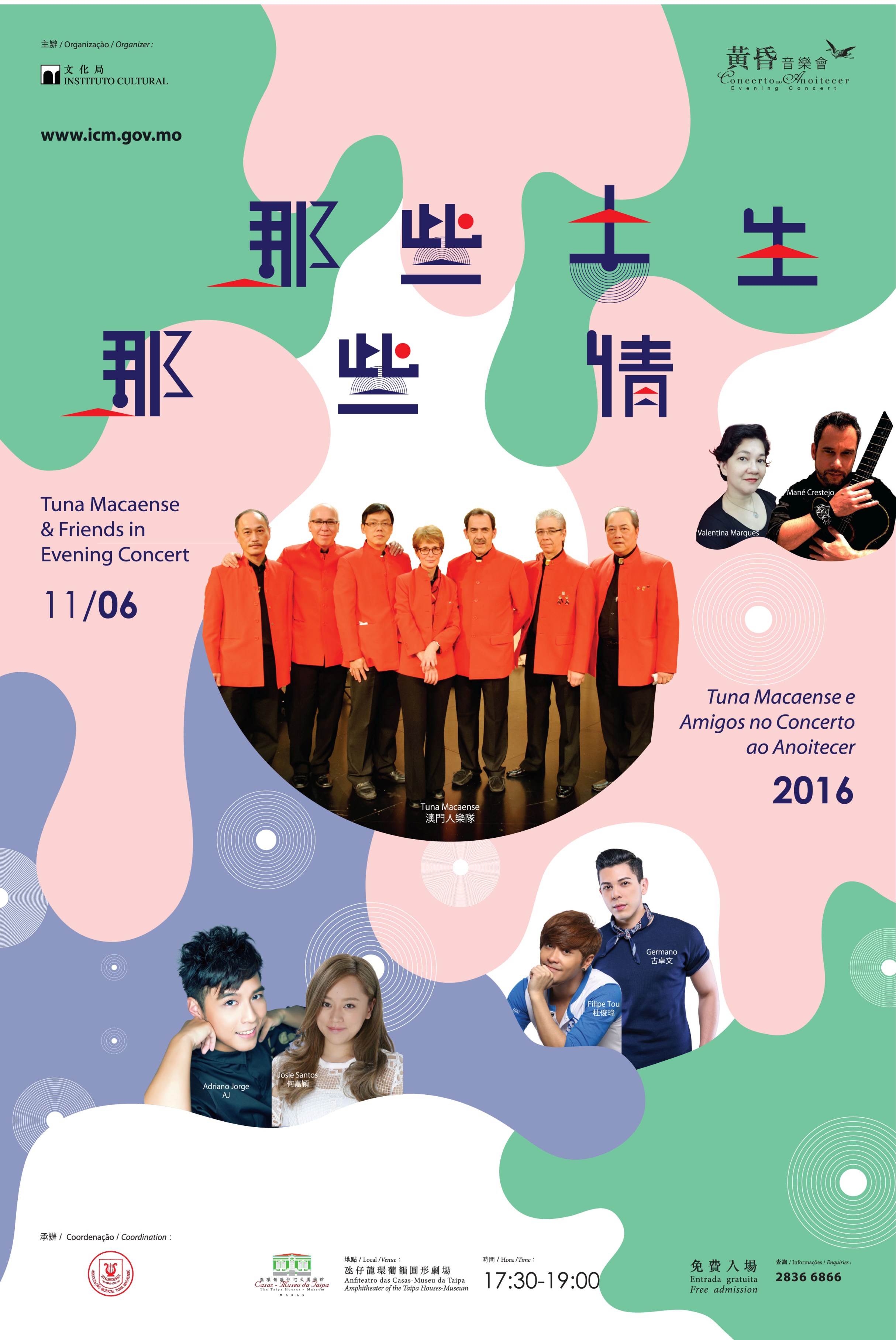 《黃昏音樂會–那些土生那些情》不設門票及劃位,免費入場。歡迎市民及旅客來臨欣賞,於富有葡國建築特色的環境下,感受土生葡人的音樂文化。