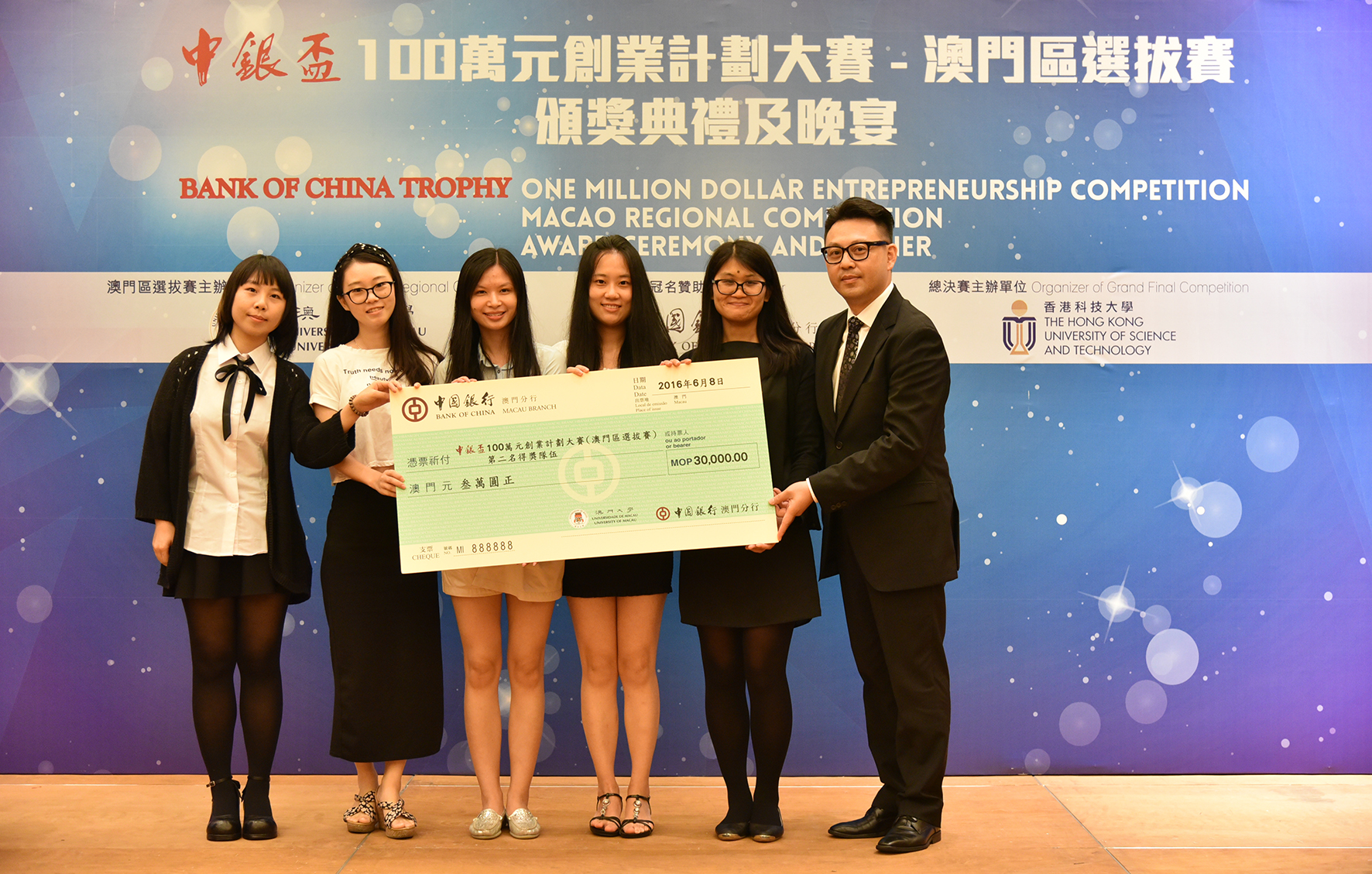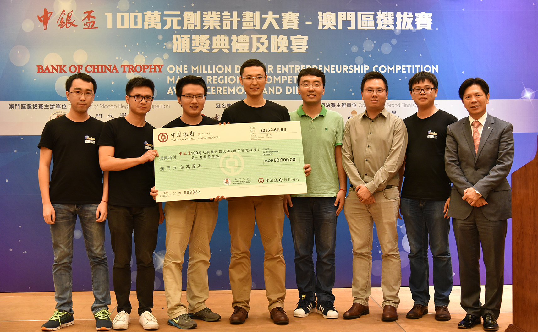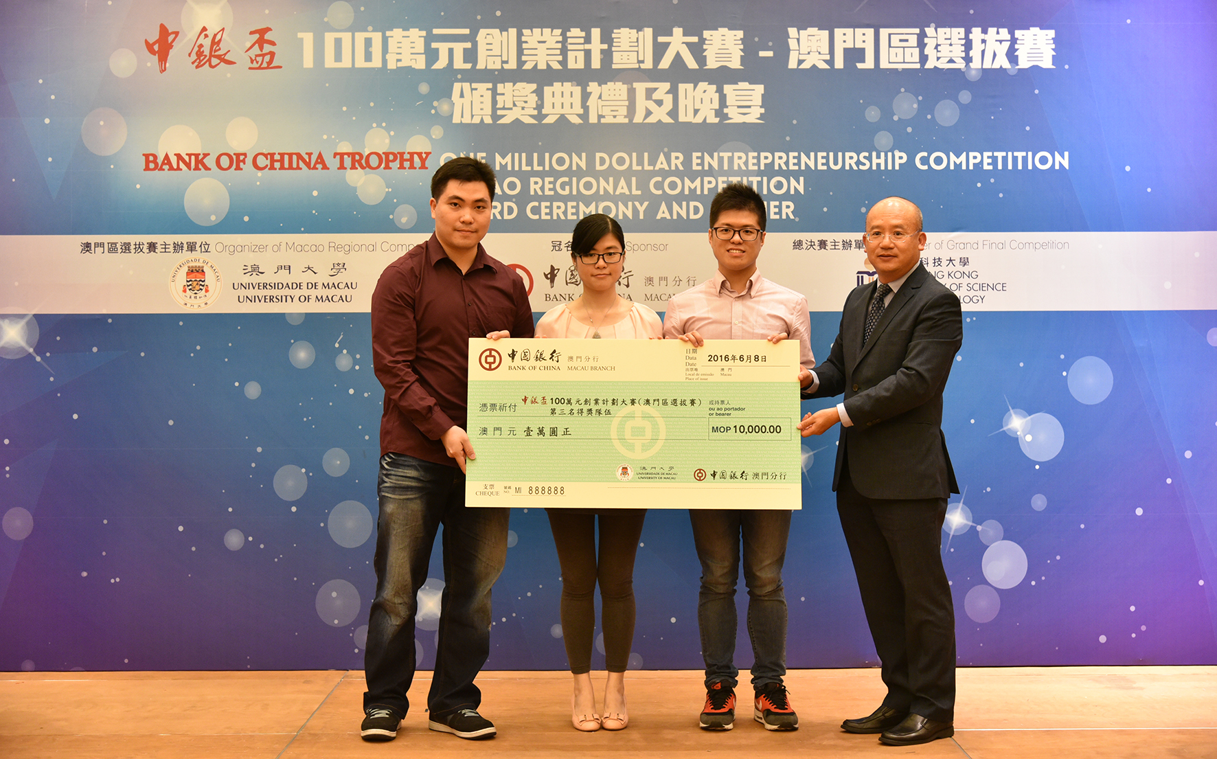 澳門大學三支學生隊伍在“中銀盃100萬元創業計劃大賽(澳門區選拔賽)”囊括首三名,並同時奪得“最佳展覽獎”和“最佳電梯行銷簡報獎”。三支優勝隊伍將代表澳門進入總決賽,與其他地區的優勝隊伍競逐一百萬的創業起動資金。