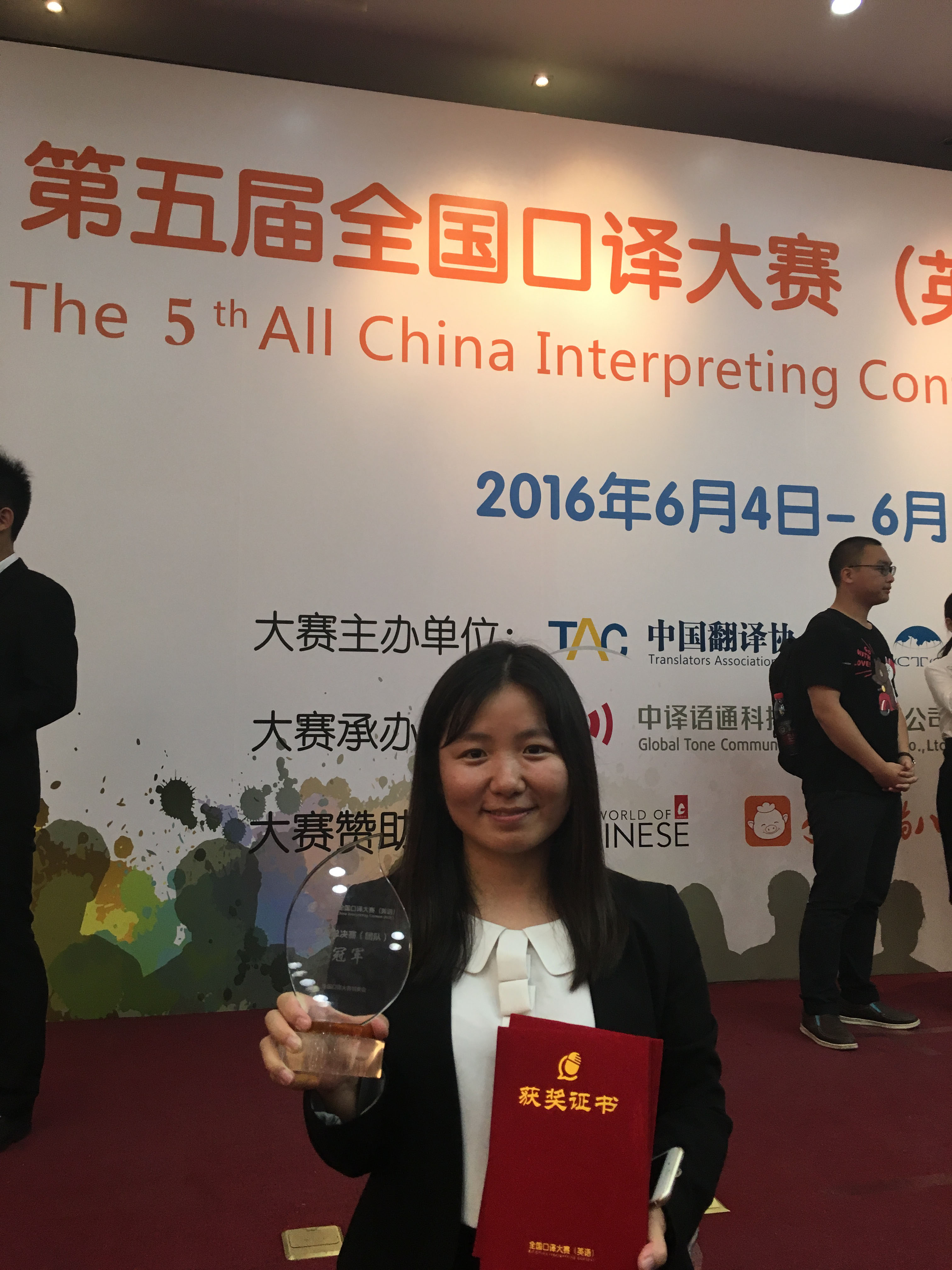 澳門大學人文學院英文系師生於北京舉行的第五屆全國口譯大賽(英語)總決賽表現突出:翻譯碩士課程學生張小平獲同聲傳譯銀牌;語言學博士生楊姍姍率領港澳區選手,在交替傳譯總決賽勇奪團體冠軍;楊姍姍還獲得交替傳譯個人賽優秀獎和全國口譯大賽人氣之星的榮譽;帶隊老師李麗青博士獲大會頒發“優秀指導教師獎 ”,成績斐然。