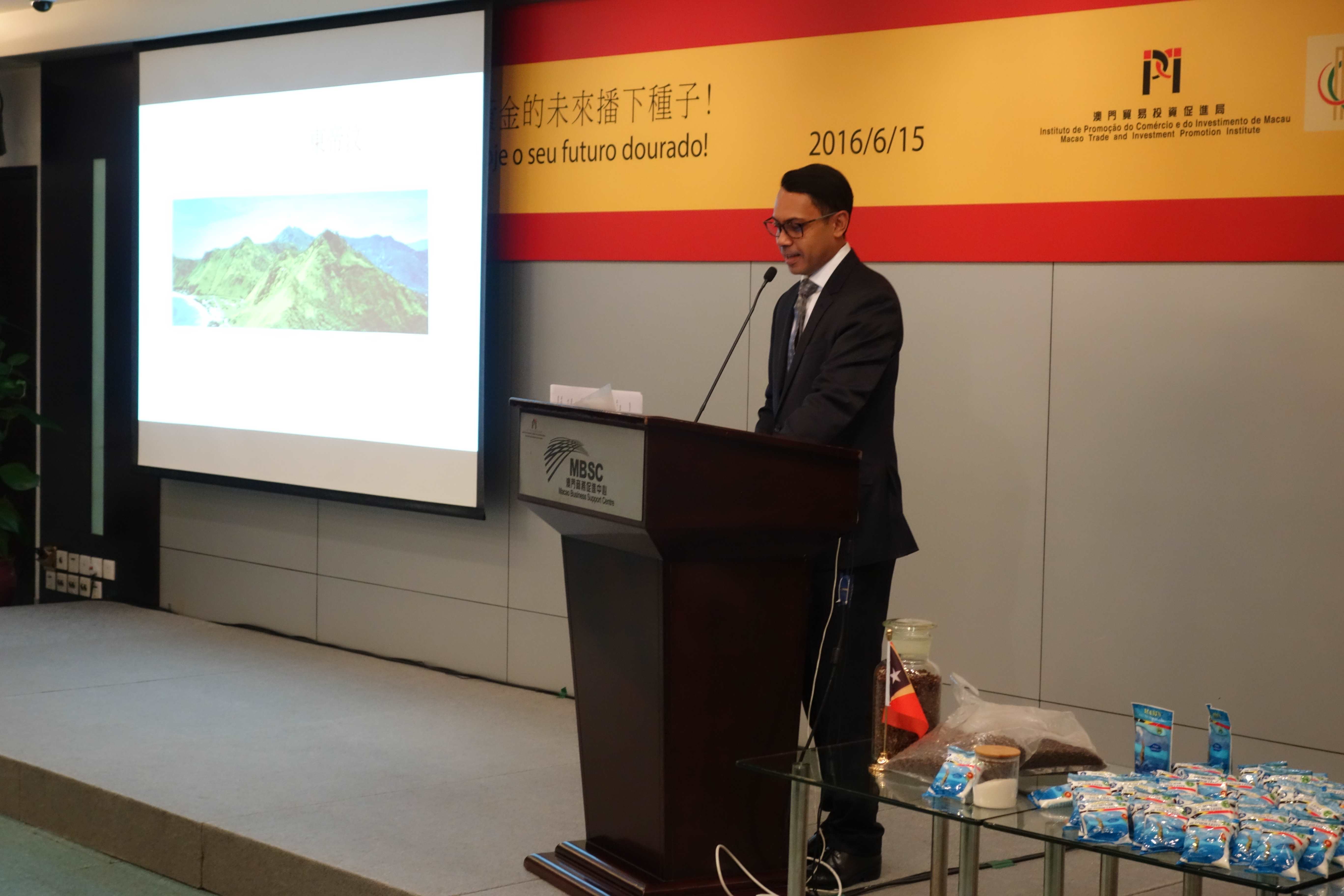 是次推介會邀請了中國-葡語國家經貿合作論壇(澳門)常設秘書處東帝汶派駐代表東晨光 (Danilo Henriques)擔任主講嘉賓,會上積極推介東帝汶投資環境及市場商機,並介紹當地成立公司的一站式服務以及免稅優惠政策等。活動亦邀請了東帝汶製鹽企業(NTM Industries Unipessoal Lda)代表Subhas Mishrah、東帝汶律師事務所(CRA Timor Advogados)駐澳代表Goncalo Neves Lestro,以及有與東帝汶貿易經驗的藝天企業香薰香海岸家族代表陳國生,就投資當地及產品進口作經驗分享,讓與會者加深對東帝汶產品的認識,協助大家尋找合作商機,有利推動兩地的經貿合作發展。