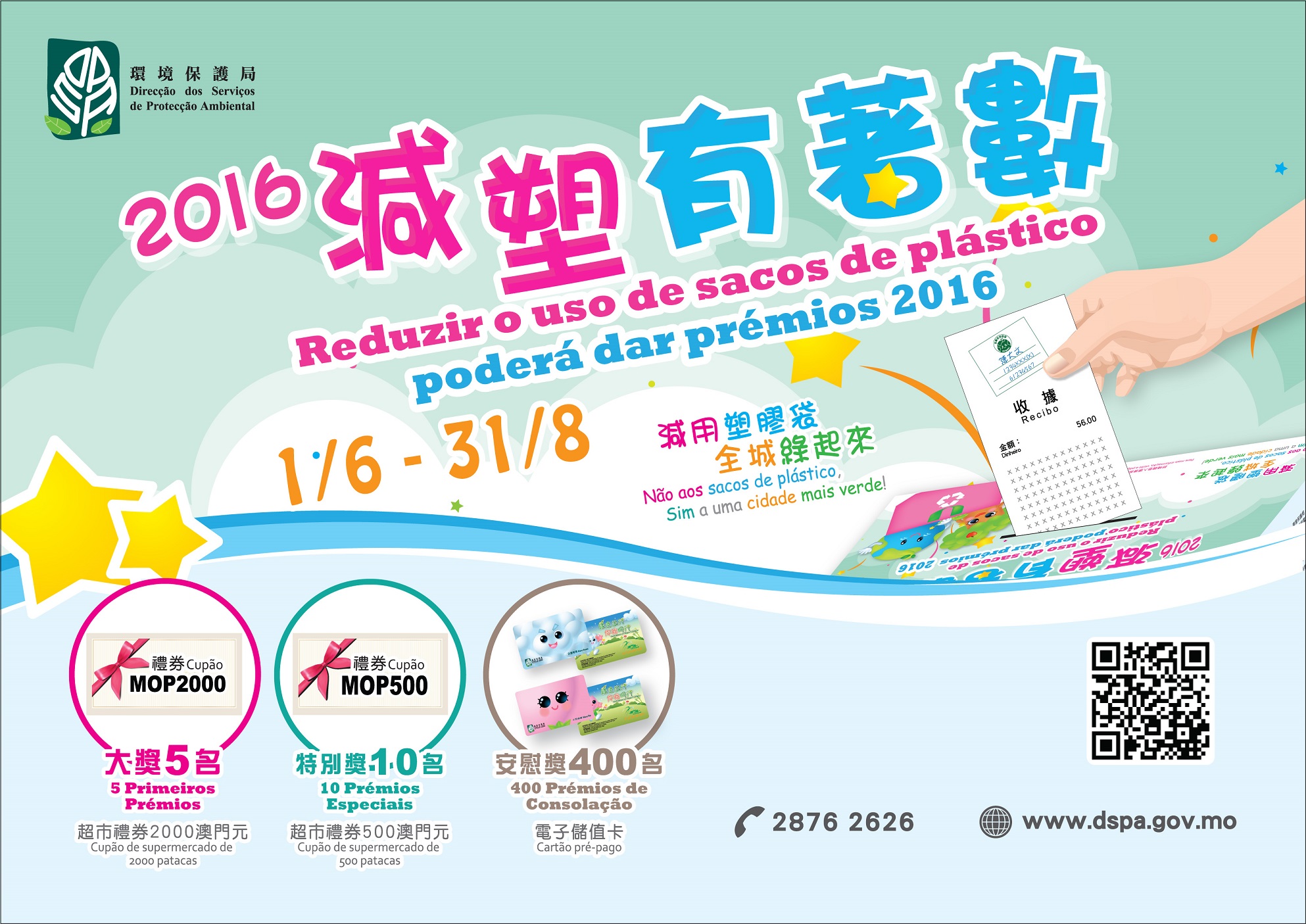為鼓勵和推動公眾愛惜資源、減少使用膠袋,環境保護局今年繼續舉辦「減塑有著數」活動。凡澳門居民於2016年6月1日至8月31日期間到35間指定商號,超過210間分店消費時不索取膠袋,或自備購物袋,則可於收據單上加蓋指定印章,填妥個人資料後投入活動專屬收件箱內,即可參加大抽獎,獎品豐富,包括:大獎5名(超市禮券2,000澳門元)、特別獎10名(超市禮券500澳門元)及安慰獎400名(內含100澳門元的電子儲值卡)。