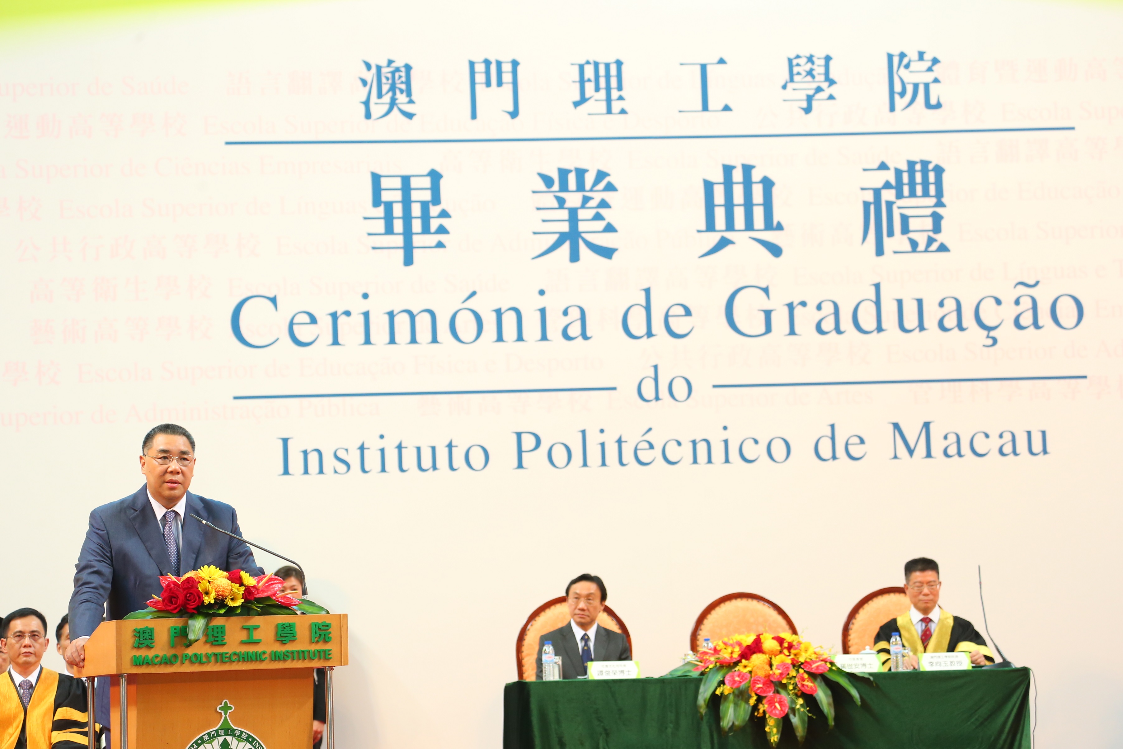 行政長官崔世安出席澳門理工學院畢業典禮的致詞中指出,教育是增強社會綜合競爭力,提高居民生活素質的有力保證。特區政府加快建設教育和人才培養長效機制,從政策支持、資源投入、制度完善等多個層次,促進教育全面發展。在高等教育領域,盡快制訂長遠發展規劃,完善《高等教育制度》,以及配套的法律法規,加大高教事業的投資,持續優化教學環境和設施,支持師資培訓,組建優質高效的教職員隊伍,促進高教水平的全面提升;整合各項支持澳門居民就讀高等教育的優惠政策,為本地經濟適度多元,培育多元人才。同時,特區政府支持理工充分發揮自身優勢和特色,支持理工主動接受海內外教育評審機構的學術評鑒,與時俱進,強化教學、科研和服務社會的功能,為澳門全面深化人力資源開發,拓寬人才儲備作出應有的貢獻。行政長官崔世安並勉勵畢業同學學以致用,貢獻社會,實現人生的理想。