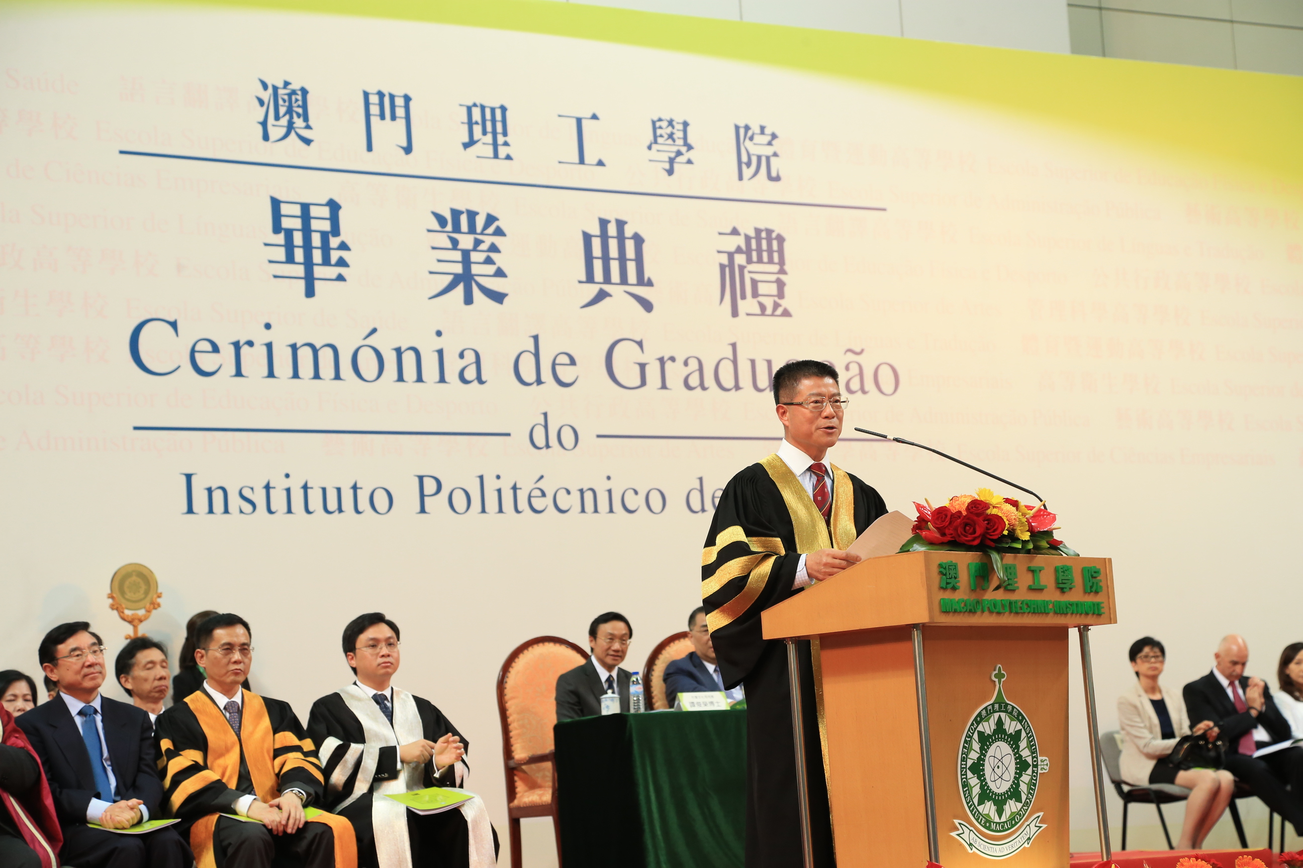 院長李向玉在講話中表示,澳門理工學院近十七年來學位課程畢業生已經超過一萬六千人。今天,澳門理工能夠成為了亞洲第一所通過全球權威的教育評審機構——英國高等教育質量保證局學術評審的高校;享有了博彩教學與研究、葡語教學與研究等方面的優勢和影響力;取得了本地報讀理工的人數連年位居全澳高校之首和90%以上的僱主給予理工畢業生好評等佳績,完全是理工在澳門回歸以來,與時俱進,不斷創新,並且得到特區政府和社會支持的結果。李向玉強調,發揮創新思維,適應不斷發展變化的社會、政治、經濟形勢,配合落實澳門特區政府的施政方針,無疑是歷史賦予的莊嚴使命。理工學院決心與社會各界一道,攜手共進,為創造澳門美好的明天做出應有的貢獻。
