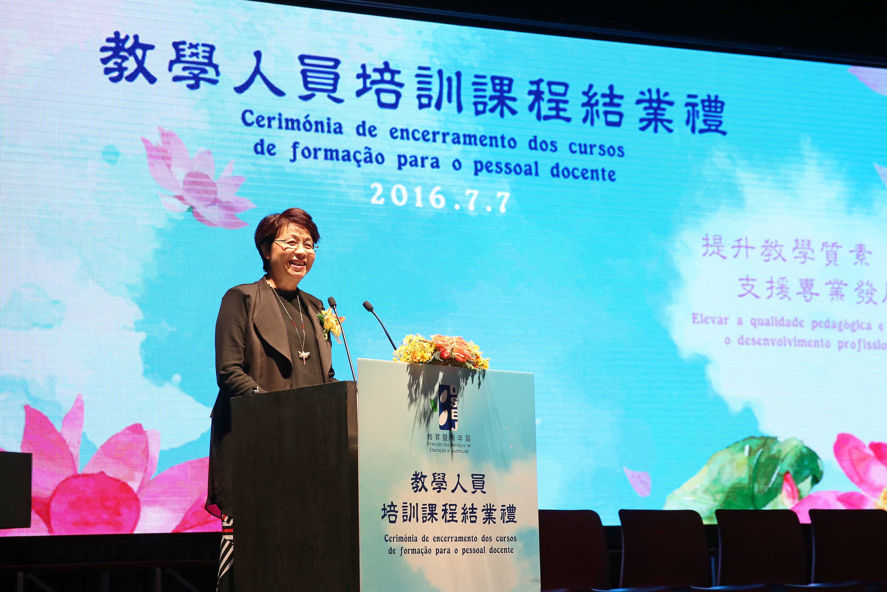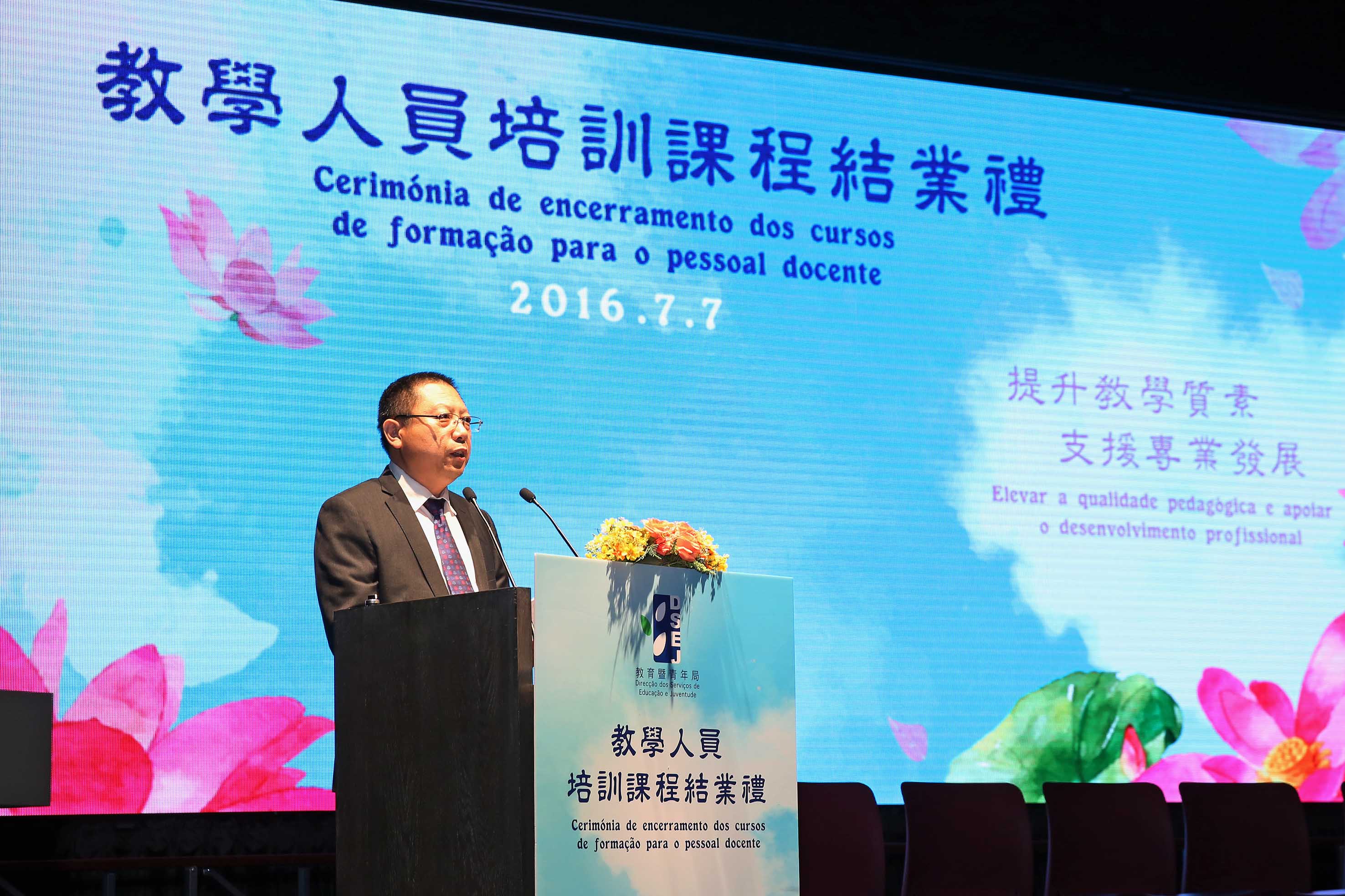 為了與教學人員共同分享完成培訓的碩果與喜悅,同時藉此鼓勵教學人員持續進修,為教育質素不斷的提升作出貢獻,教青局於7月7日下午在聖保祿學校禮堂隆重舉行了“2015/2016學年教學人員培訓課程結業禮”。 社會文化司司長譚俊榮、社會文化司司長辦公室主任葉炳權、教青局局長梁勵、中央人民政府駐澳門特別行政區聯絡辦公室文化教育部副部長浦海龍、社會文化司司長辦公室顧問惠程勇、教青局副局長老柏生和郭小麗、教育部港澳台事務辦公室主任科員張君、澳門大學教育學院院長范息濤、澳門理工學院語言暨翻譯高等學校代校長崔明芬、澳門大學人文學院葡文系主任Maria Fernanda Gil Costa、澳門中華教育會會長何少金、澳門天主教學校聯會會長周伯輝,以及培訓機構的代表及導師、各校校長及參加培訓課程的600多名教學人員出席了典禮。