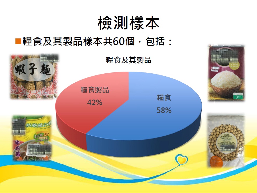 是次專項調查中,共抽查了六十個糧食及其製品樣本,包括於本澳各區超級市場及百貨公司抽取的預包裝麵粉、米及豆類等糧食樣本,以及玉米片、麵類及豆漿等糧食製品樣本,產地來源包括中國內地、台灣、香港、澳門、泰國、澳洲、柬埔寨、法國、日本、老撾、美國、葡萄牙、越南、印度尼西亞、土耳其、英國、加拿大、阿根廷、意大利及馬來西亞等國家或地區。檢測項目包括重金屬及真菌毒素,當中重金屬項目包括鉛、鎘、總汞及總砷,而真菌毒素項目包括赭曲霉毒素A。調查結果顯示,所有樣本均未見異常。