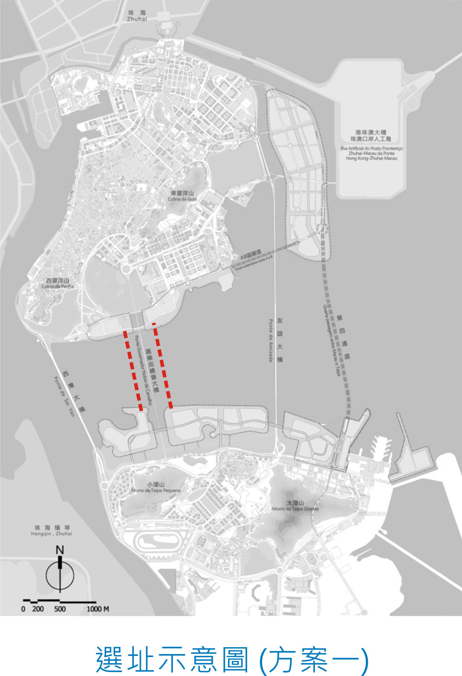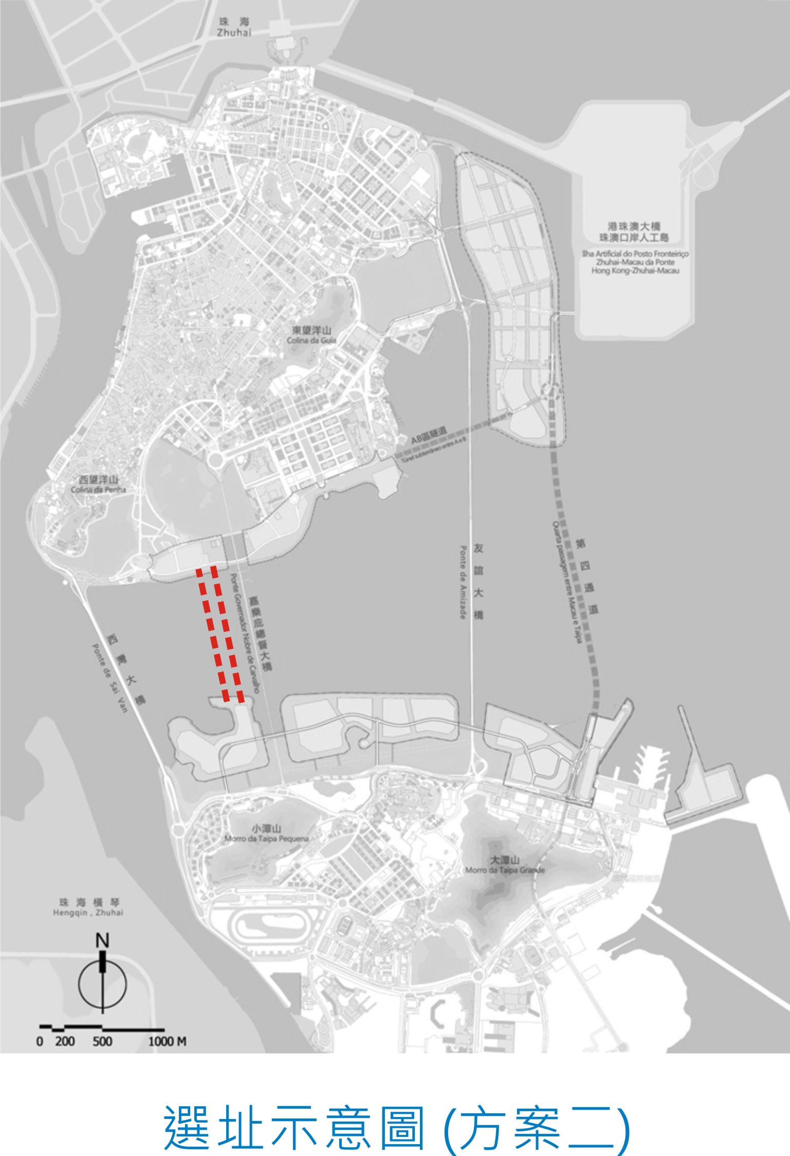 考慮到該處是澳門半島與氹仔之間的海面距離最短的地方,以及避免影響嘉樂庇總督大橋及周邊區域的景觀,土地工務運輸局經初步研究後,認為適宜在嘉樂庇總督大橋旁以隧道形式興建跨海通道,以連接新城填海C、D區(氹仔)及新城填海B區(澳門)。每條隧道初步估計全長約1,200米(即嘉樂庇總督大橋總長度一半)、最少兩線單向行車道,其中一條隧道向澳門半島方向,另一條向氹仔方向。選址包括三個方案,即大橋兩邊各建一條隧道管道、大橋西邊建兩條隧道管道或大橋東邊建兩條隧道管道。