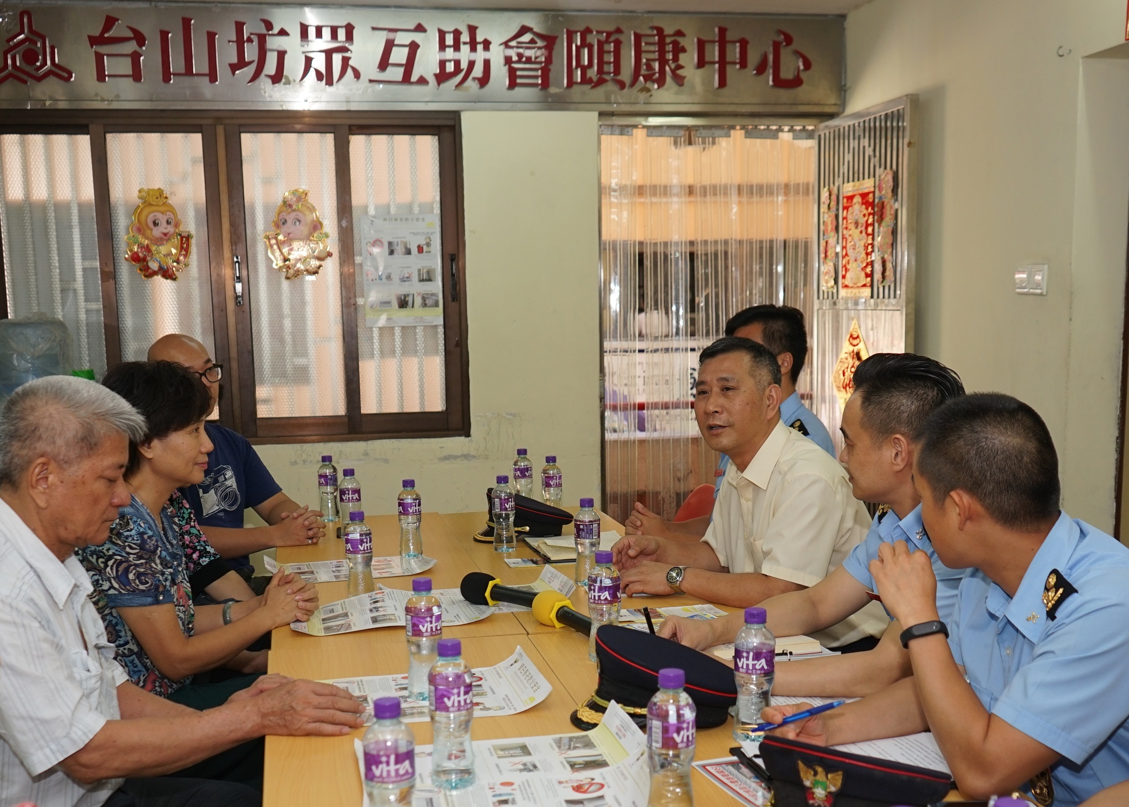於7月28日消防局派員拜訪“台山坊眾互助會”,除就盂蘭節期間的防火工作及行動部署等方面交換意見,亦為“台山坊眾互助會”會員舉辦防火、燃氣安全及救護知識講座;此外,在坊會義工的協助下,到區內向居民、遊客及商舖負責人派發宣傳單張及海報。