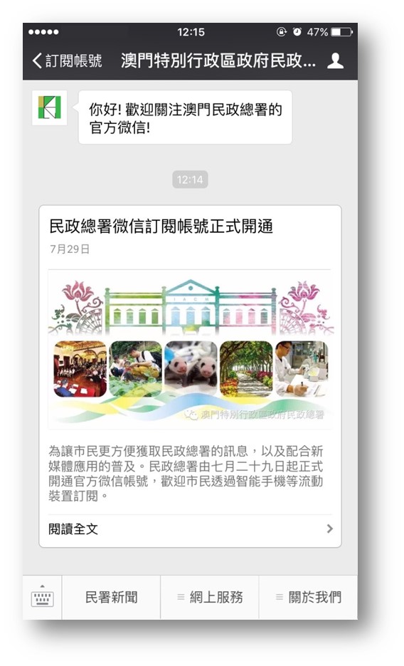 使用智能手機等流動裝置已成為市民的日常生活習慣,為進一步配合市民逐漸普及使用新媒體獲取資訊的方式,並能夠更便捷地獲取民署最新的資訊,民署繼二○一五年開通了手機版的民署官方網頁後,現在亦正式開通官方微信訂閱帳號。