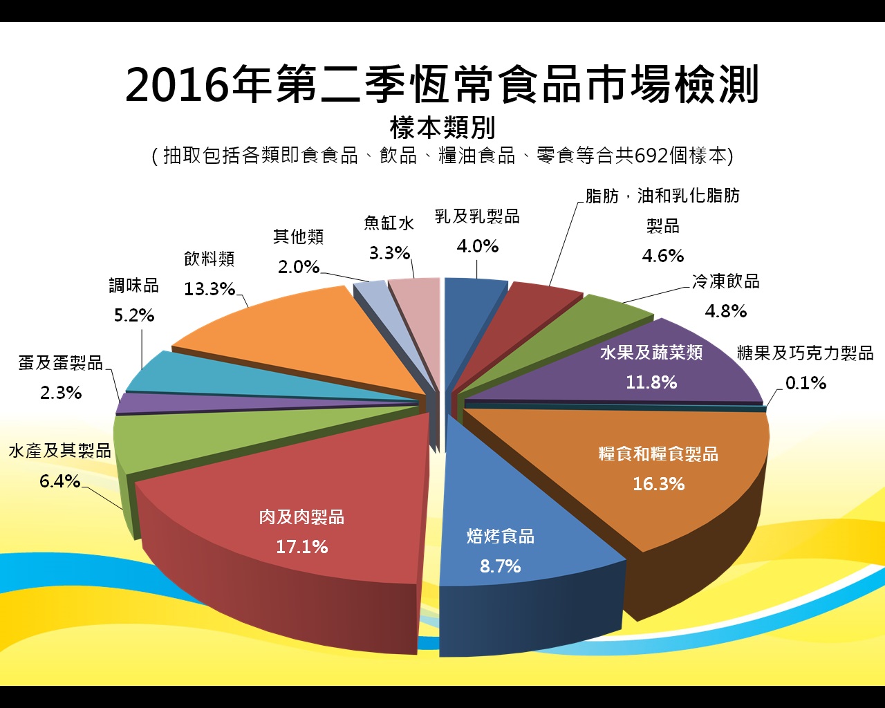 食安中心依據目前流通市場的食品種類和特點,在本澳各區之超級市場、雜貨店、百貨公司、飲食場所及外賣店等,抽取各類即食食品、飲品、糧油食品、零食等。本年第二季合共抽取六百九十二個樣本進行化學、微生物學及輻射水平等檢驗,整體合格率達99.5%。