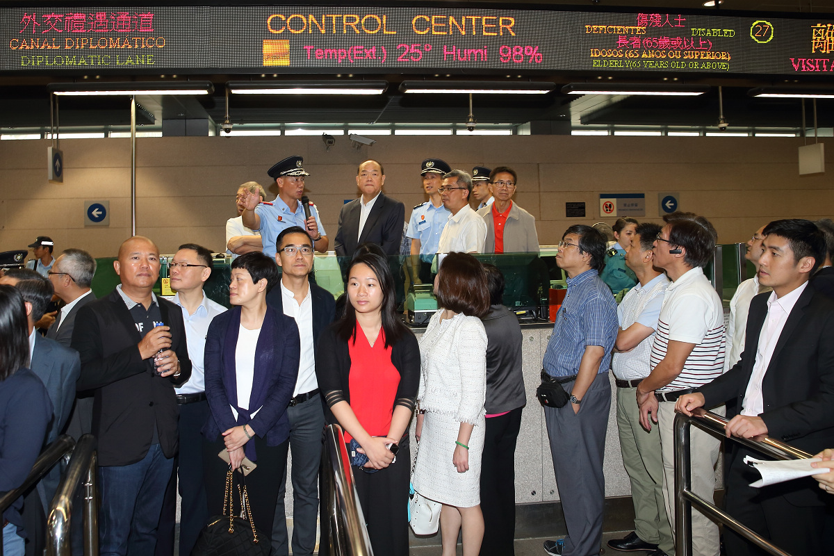 治安警察局首先在特警總部向來訪的立法議員一行介紹了該局的組織架構、警務、交通和出入境管理工作,匯報了關於今年4月30日本澳口岸出入境系統突發情況的處理,並進行了警方就群眾暴力事件和家庭暴力事件的應對演練,展示“特別巡邏組”近期的工作和訓練情況以及特殊警種裝備。隨後局方邀請了議員巡視關閘邊境站出入境大堂驗證櫃枱和控制台的日常運作,議員們對口岸進出人流管理與疏導,以及自助過關通道、學童專道和面容識別系統等設施對提升通關效率的作用,有了更深入的瞭解。
