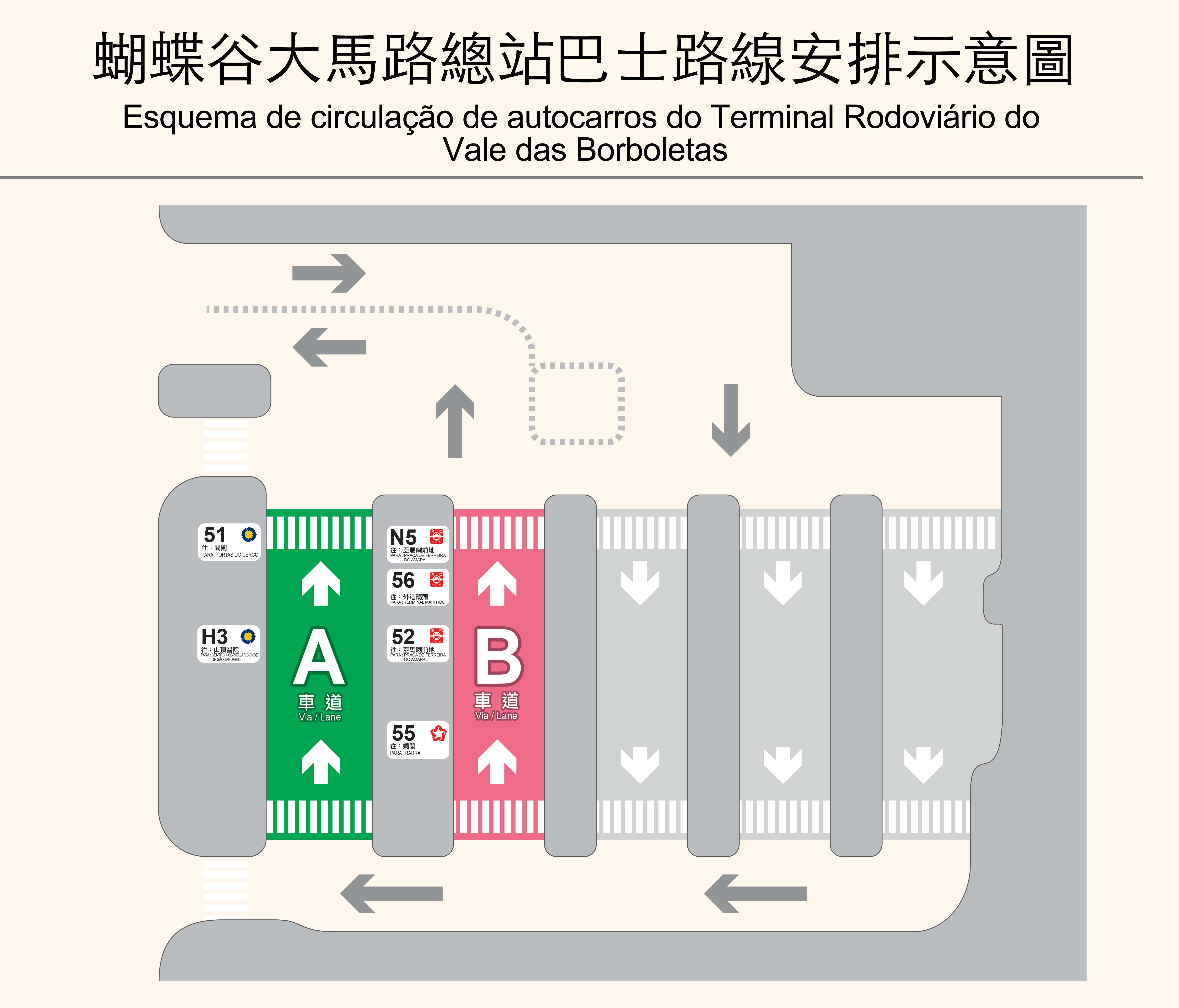 設於石排灣綜合社區大樓地面層的“蝴蝶谷大馬路總站"設有5條巴士車道;其中,A、B車道為上客區;C、D、E車道為落客區。現階段有6條巴士路線以此為總站發車,分別是51、52、55、56、H3及N5路線,現場設有排隊設施和指示牌等,方便乘客候車;而原來位於和諧廣場兩側的“石排灣臨時巴士總站”,會作為中途站繼續予上述路線停靠,臨時巴士總站並重新命名為“和諧廣場/業興大廈"站及“和諧廣場/樂群樓"站。此外,位於樂居大馬路的巴士站,亦會重新命名為“樂居大馬路/居雅大廈"站及“樂居大馬路/樂群樓"站。因應上述總站的啓運,55路線中途不停靠原“樂居大馬路/居雅大廈"站,改為停靠“和諧廣場/樂群樓"站。為確保有關巴士總站的暢順運作,局方亦於總站出入口增設交通燈,並於8月19日 (周五)下午4時起啟用。