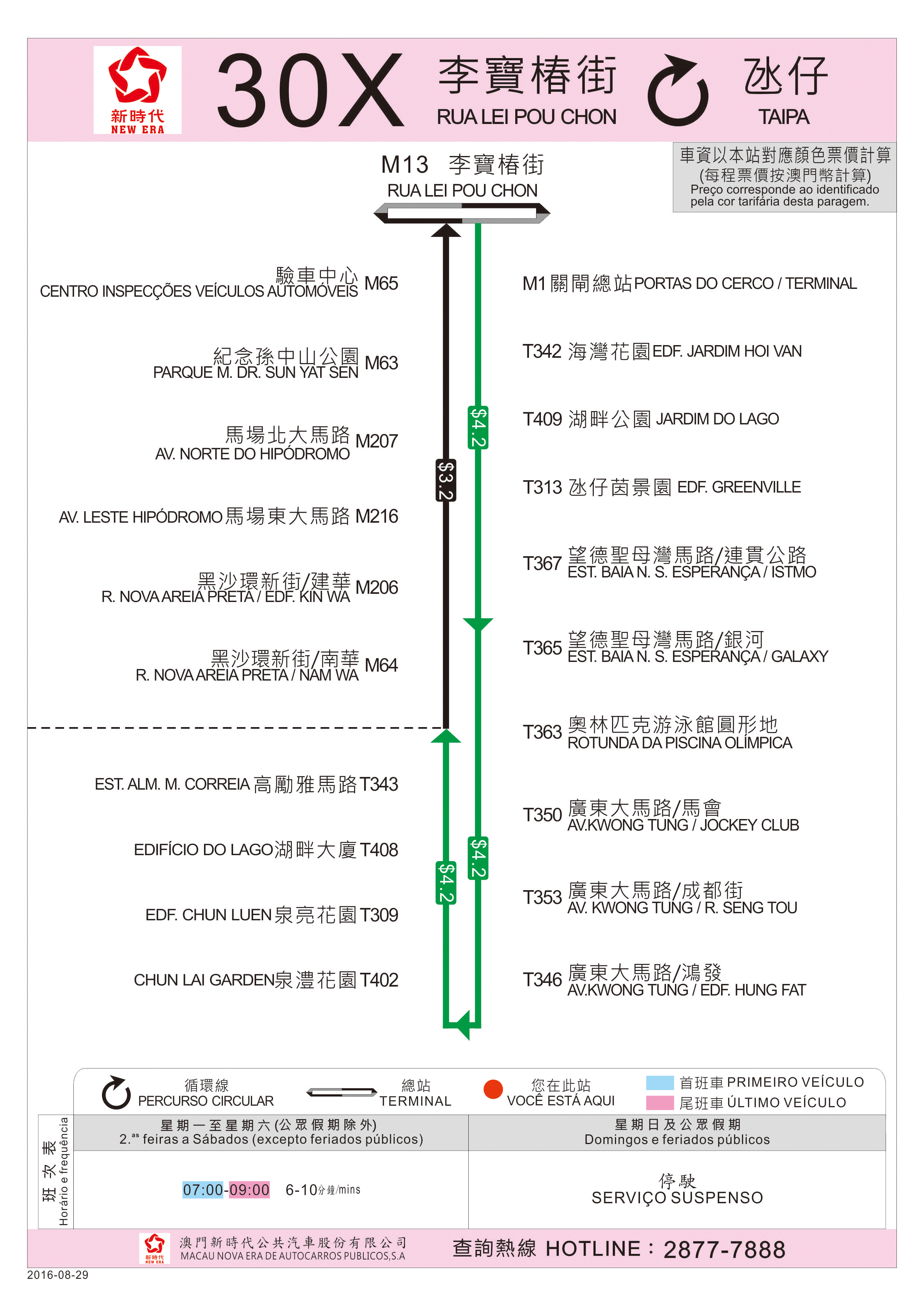 該路線由8月29日(周一)起逢周一至周六上午7時至9時營運,班次為6至10分鐘一班,由新時代公共汽車股份有限公司以大巴營運。由“李寶椿街"站出發,途中停靠“關閘總站"、“海灣花園"站、“湖畔公園"站、“氹仔茵景園"站、“望德聖母灣馬路/連貫公路"站、“望德聖母灣馬路/銀河"站、“奧林匹克游泳館圓形地"站、“廣東大馬路/馬會"站、“廣東大馬路/成都街"站、“廣東大馬路/鴻發"站、“泉澧花園"站、“泉亮花園"站、“湖畔大廈"站、“高勵雅馬路"站、“黑沙環新街/南華"站、“黑沙環新街/建華"站、“馬場東大馬路"站、“馬場北大馬路"站、“紀念孫中山公園"站、“驗車中心"站,及後返回“李寶椿街"站。因應30X路線啓運,30路線在上午尖峰時段的班次會調整為6至10分鐘一班。