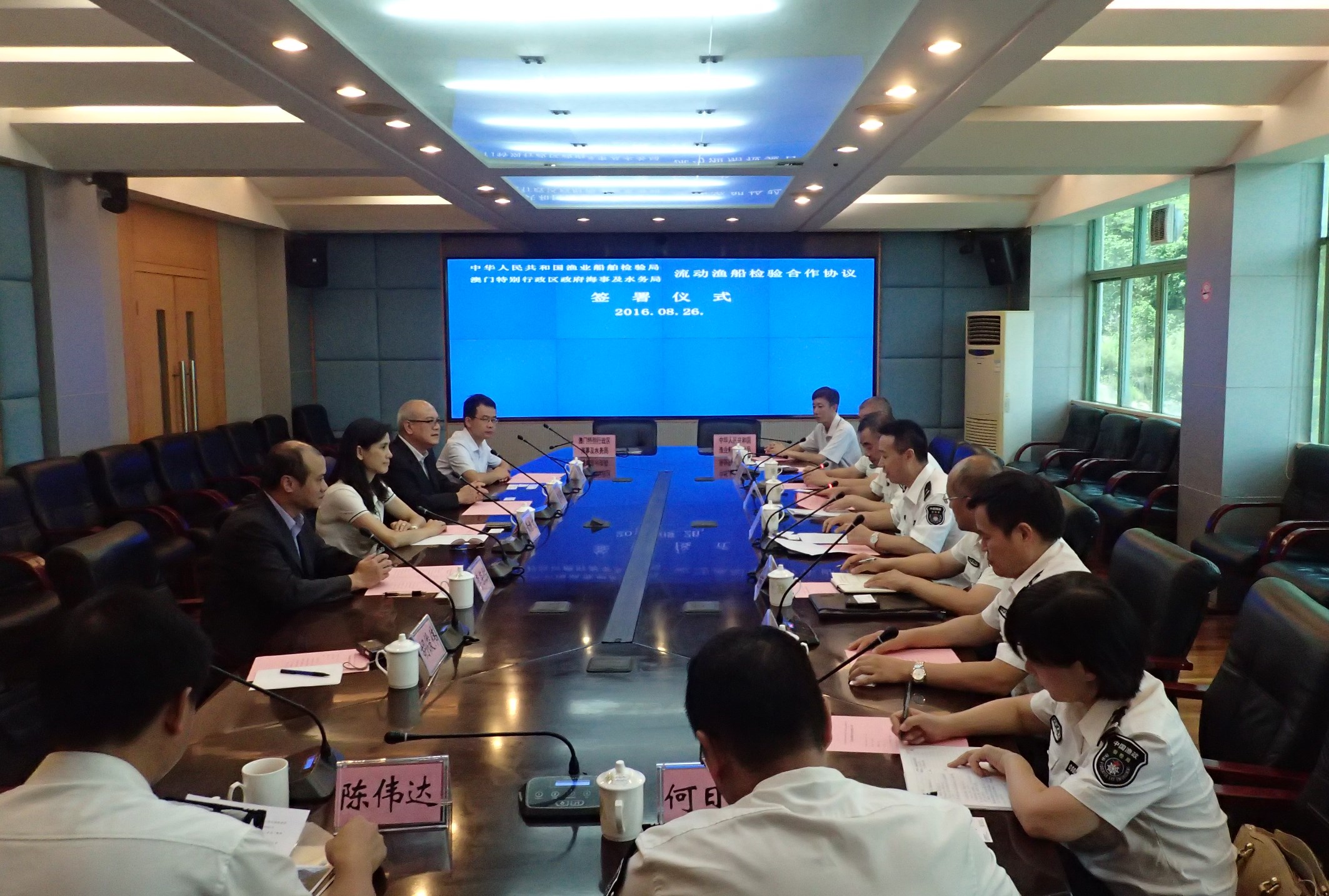 出席簽署儀式的還包括廣東省海洋與漁業局副局長白樺、珠海市海洋農業和水務局局長林粵海、澳門海事及水務局副局長曹賜德、船舶及船員廳廳長李榮勝等。