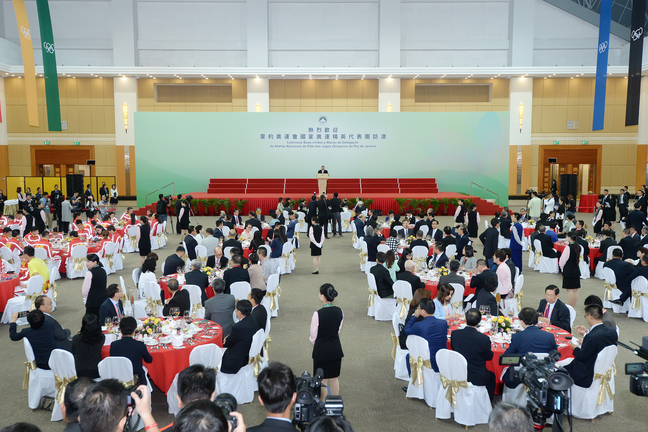 特區政府今(29)日傍晚設宴,歡迎里約奧運會國家奧運精英代表團。行政長官崔世安致辭時表示,期望藉着代表團是次訪澳,讓澳門的青少年向運動員學習,積極進取,自強不息。今次代表團的到來,必將再次點燃澳門居民對體育運動的極大熱情,也將積極推動體育事業進一步發展。