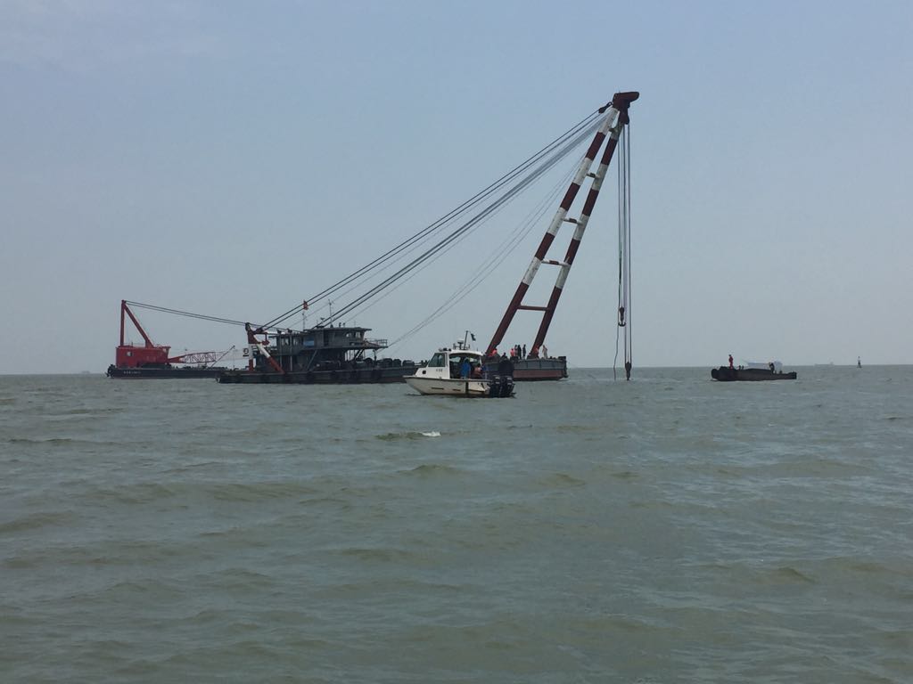 起重船在海事局船隻的監督下進行的打撈起吊作業