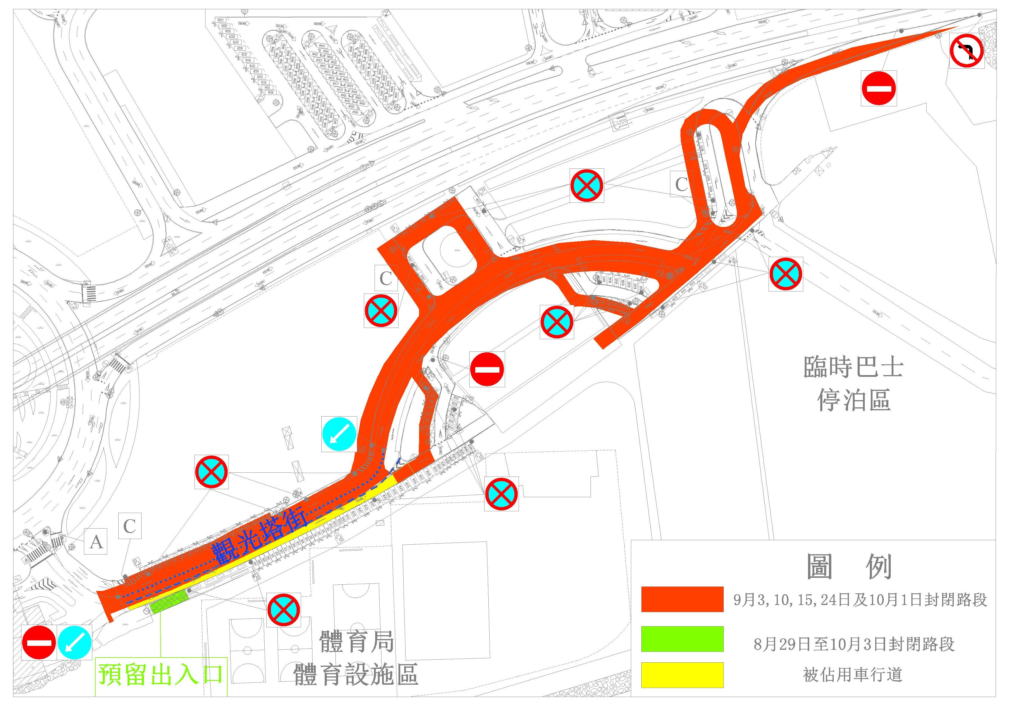 活動舉行當日晚上9時至11時,觀光塔街將臨時封閉交通,僅允許公共巴士及緊急服務車輛通行;而當日晚上8時至11時,氹仔海洋大馬路及海洋花園大馬路(近海洋花園靠海一側的路段)實施有限度通車,上述海洋花園大馬路的路段亦會臨時設置車輛停泊區,駕駛者可留意現場指示停泊車輛;與此同時,西灣湖景大馬路近澳門旅遊塔的上落客貨區、比厘喇馬忌士街近內港10號碼頭的路段則禁止泊車。