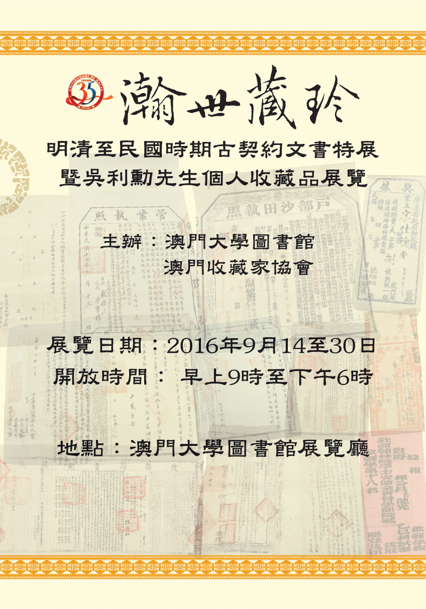 由澳門大學圖書館與澳門收藏家協會合辦的“瀚世藏珍─明清至民國時期古契約文書特展暨吳利勳先生個人收藏品展覽”將於9月14日下午4時在澳門大學伍宜孫圖書館舉行開幕暨捐贈儀式。屆時將展出明清至民國時期的契約及文書等一系列古文獻超過一百件。歡迎有趣興人士參觀。