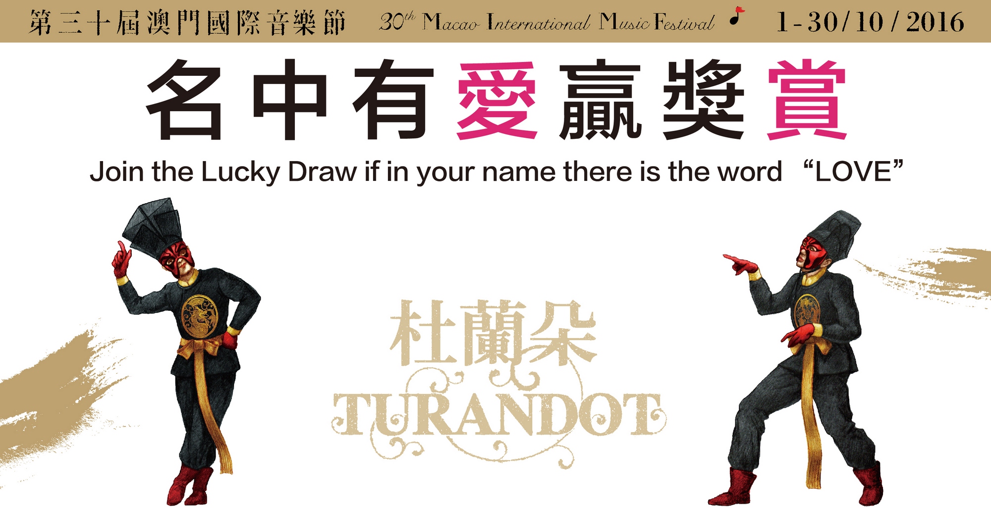 文化局第三十屆澳門國際音樂節為回饋樂迷多年來的鼎力支持,特別推出《杜蘭朵》有獎問答遊戲“公主招親!解謎勇士召喚”及 “全城尋愛” 抽獎活動,奬品豐富,歡迎市民踴躍參加。