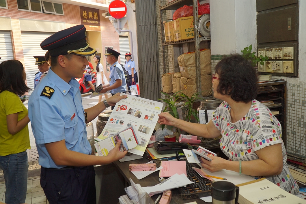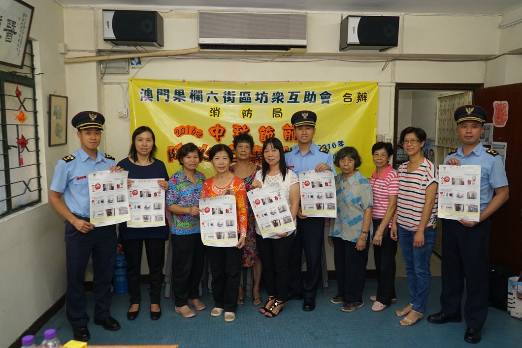 防火宣傳活動於本年8月23日至9月15日期間進行,於大堂區及嘉模堂區一帶區域,向居民派發宣傳單張及海報;此外,消防局亦於8月23日派出消防局官員拜訪“澳門果欄六街區坊眾互助會”,座談中雙方就該區的防火、滅火及救援等工作進行討論並交換意見;而於8月23日及9月1日更分別為“澳門果欄六街區坊眾互助會”及“新口岸區坊眾聯誼會”之會員各開辦一場防火及救護知識講座,並得到坊會義工的協助在區內一帶派發防火宣傳品。